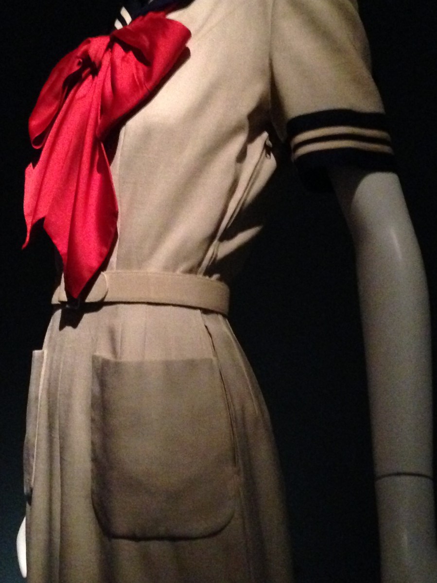 Label: Traina-Norell New York. Off-white sailor dress with navy collar and red tie, circa 1957. Linen. MFIT, Gift of Lauren Bacall.