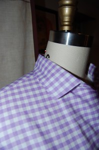 The feature I really liked about the “$375 blouse” was the spread collar.  A spread collar, of course, has a wide division between the points in front, as opposed to longer pointed ends.  I determined to alter my pattern to make my shirt look like the one in the magazine.