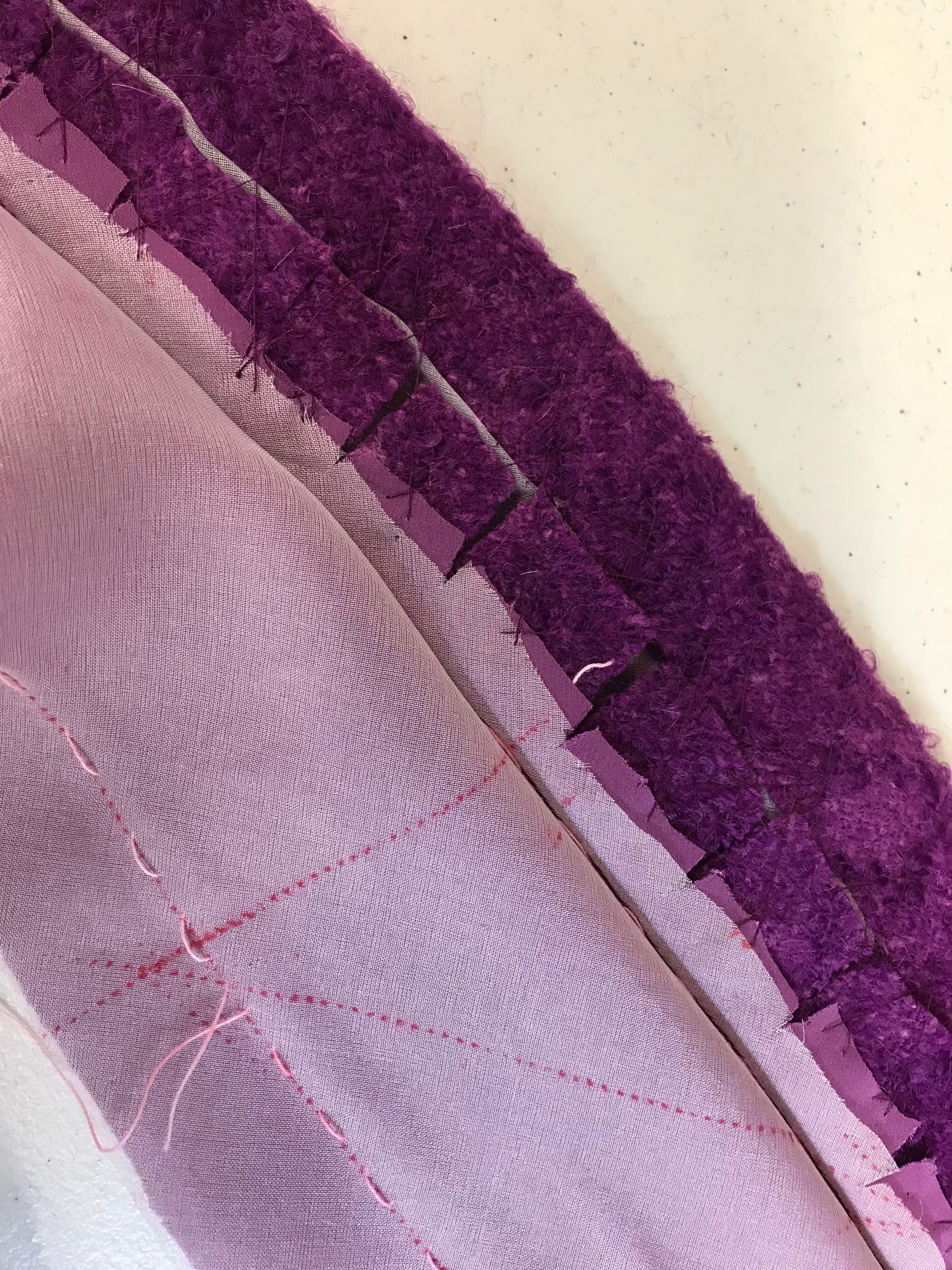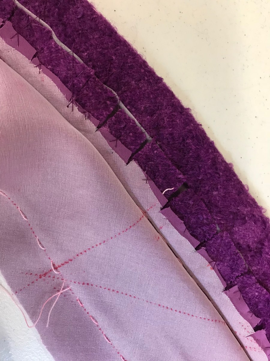 The entire coat is underlined in silk organza, including the belt, shown here with one side sewn by machine.
