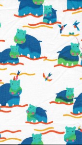 I have had this piece stored on my fabric shelves for well over twenty years. I really do not remember why I ever purchased it. I always thought it was cute and cheerful. As luck will have it, my older granddaughter’s favorite animal is a hippo! Little Miss Aida has a stuffed hippo who is well loved (almost to the point of being bedraggled!) and definitely a member of the family. There really could be no better time to use this fabric to make her a dress, especially as, at age 5, she is still happy to wear a cute print like this. (By age six, maybe not?)