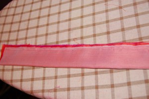 10) I sewed the long edge of that piece together. I again used a metal ruler (a smaller one this time) to position its seam along the center back of the piece. I pressed it carefully along that center seam and then turned it right side out.