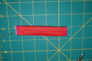 9) The strip I cut needed to wrap around the width of the belt, front and back, with ample seam allowance to tuck in. Twice around the width of the belt equaled 3” plus seam allowance of 1”. So my strip of fabric needed to be 4 inches long. Its width was twice my chosen width of ¾” (1.5”), plus seam allowance of 1”. Thus the knot would be made out of a piece of fashion fabric 4” x 2.5”.