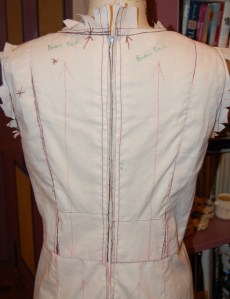 1) I decided the bow should be the width of the front panel of the bodice of the dress, which was 7”. For a finished bow, I needed to double that length, plus two ½” seam allowances, plus 1 inch for each tapered end of the bow. 7+ 7 + 1 + 1 + 1 = 17” length. The width needed to be twice the width of the belt (1.5” x 2) plus 2 seam allowances of ½” each. Total width needed to be 4” – thus I cut out a piece of fashion fabric 17” x 4”, making sure I cut it out on the crossgrain to match the belt.