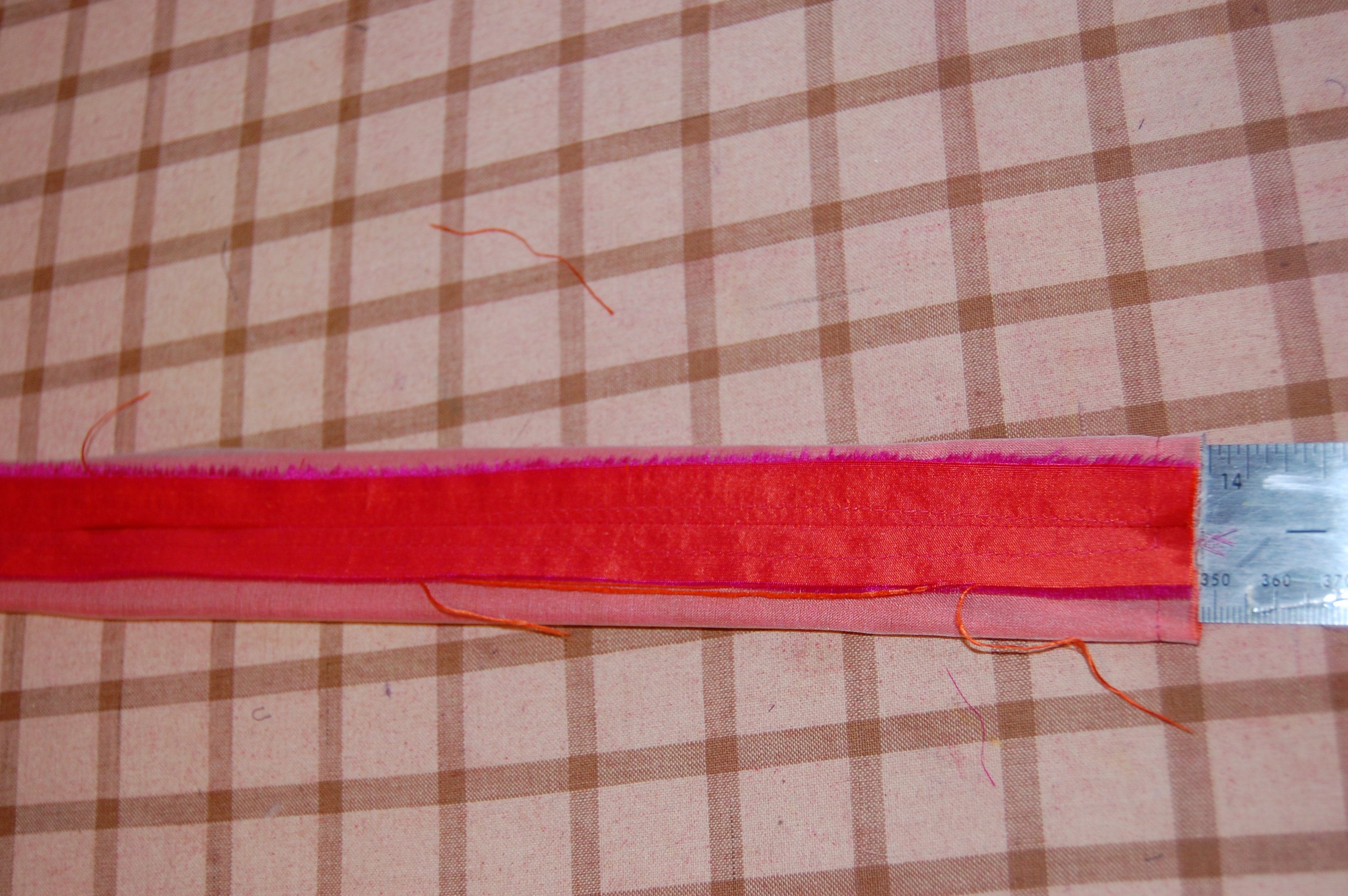 Inserting the metal ruler into the tube of fabric made centering its seam so much easier.