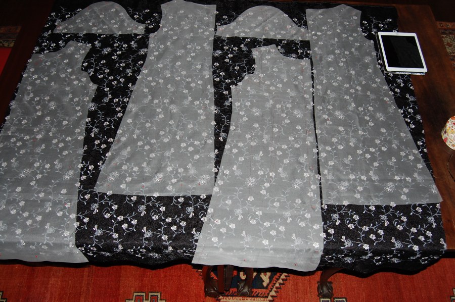 Here are the silk organza underlining pattern pieces laid out on my fabric. I had to stagger the four main pieces to fit it on the fabric. Fortunately i was still able to match the pattern of the vines and flowers. Whew!