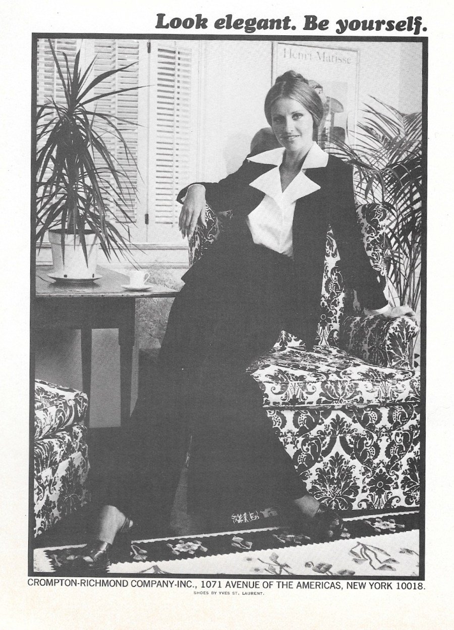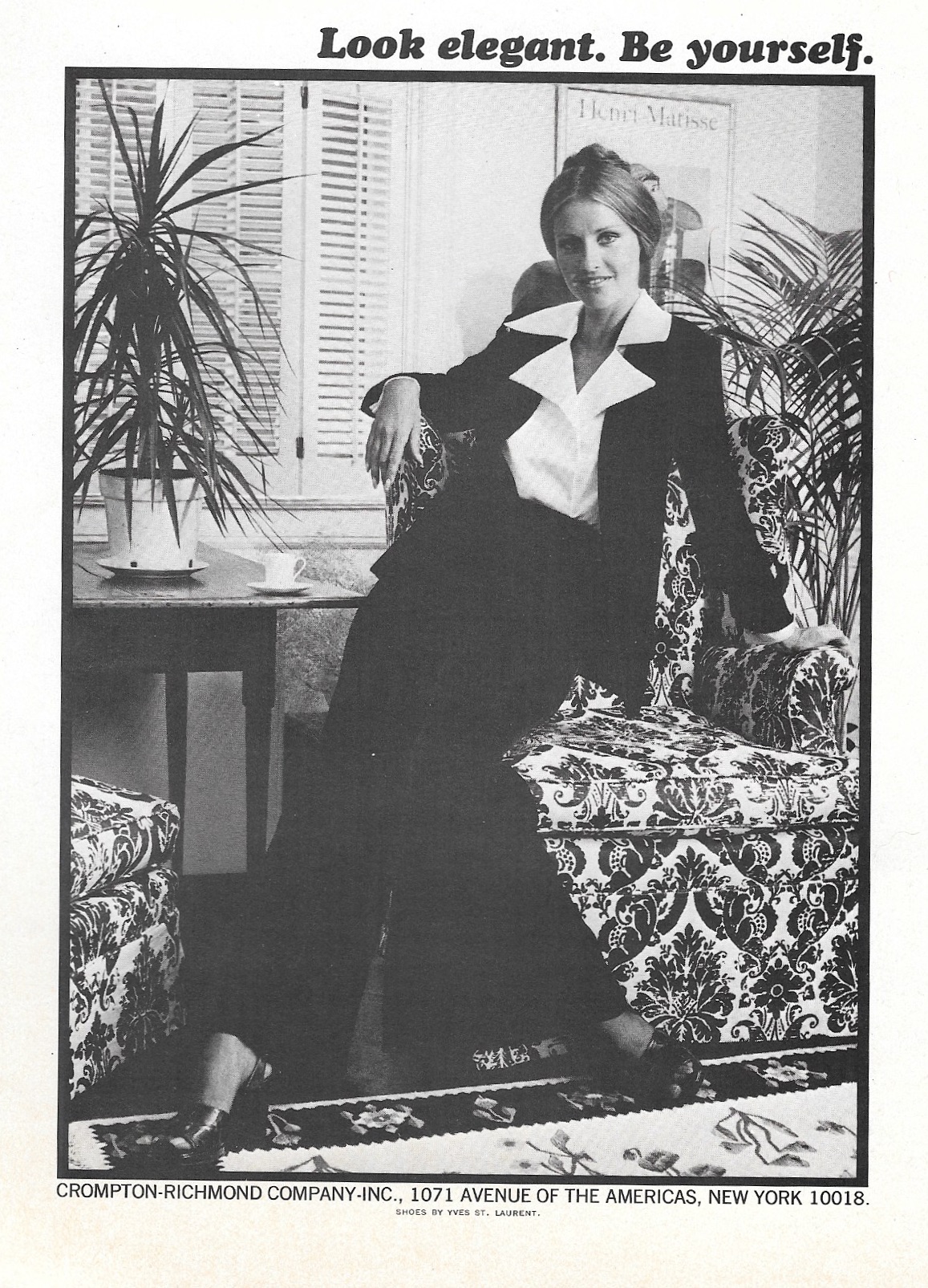 This is an advertisement for Crompton velvet, featuring a Vogue pattern (Yves St. Laurent evening suit).