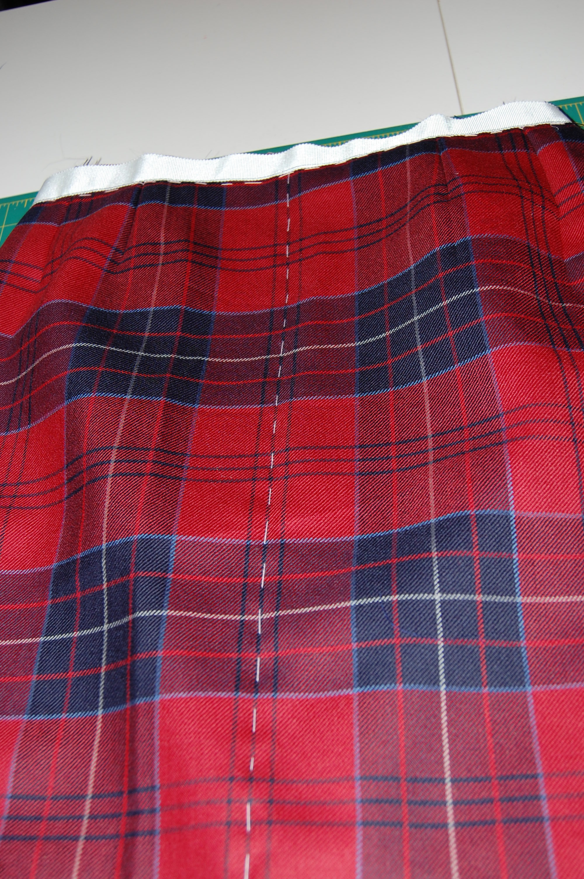 Here is that front center line, marked with a running stitch. You can also see the Petersham ribbon I used to stabilize the waistband.