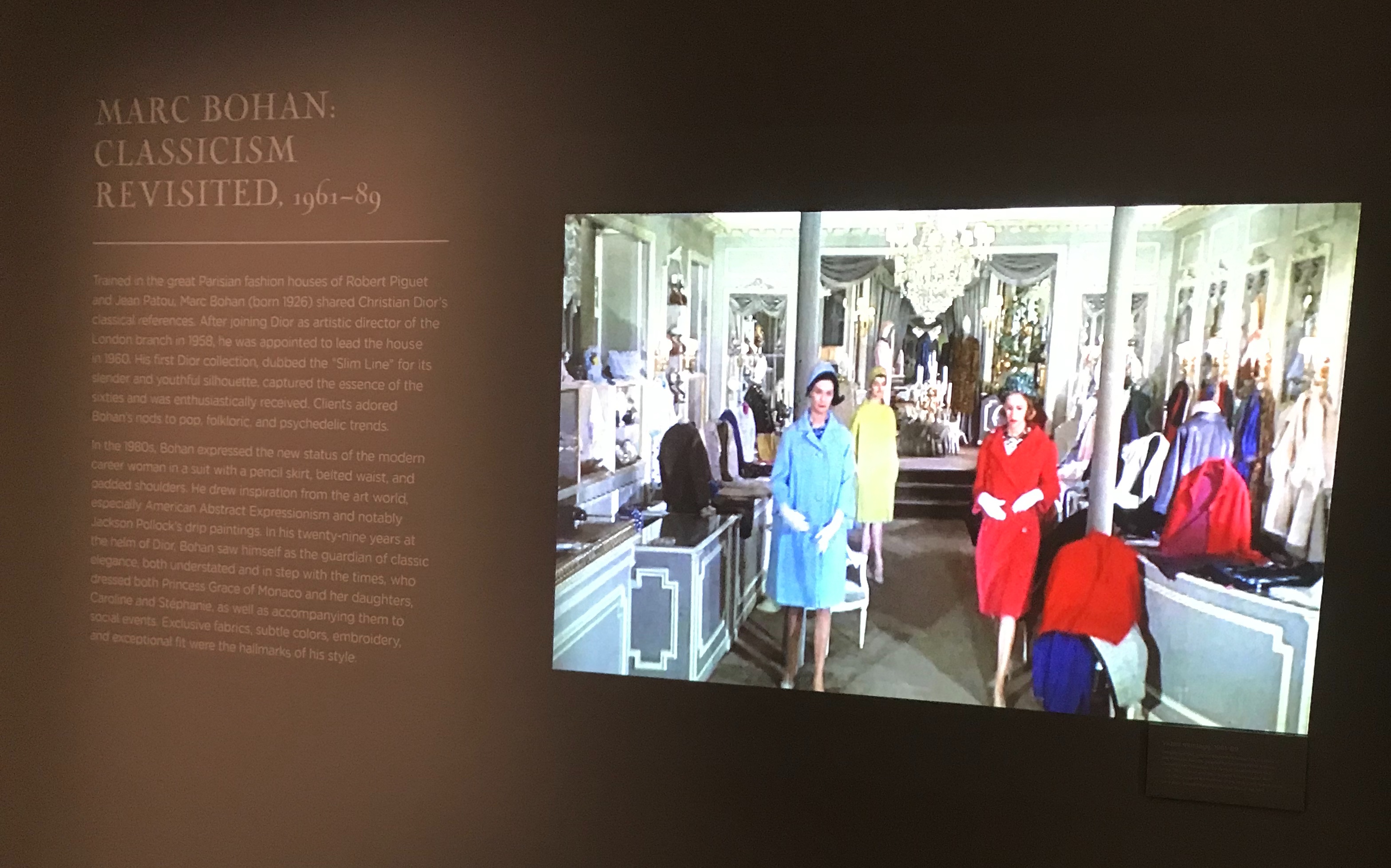 This image is from a looping video in the Bohan section of the Exhibit. Classic coats with coordinating dresses is what I think of during the 1960s, and Bohan was a master of such.