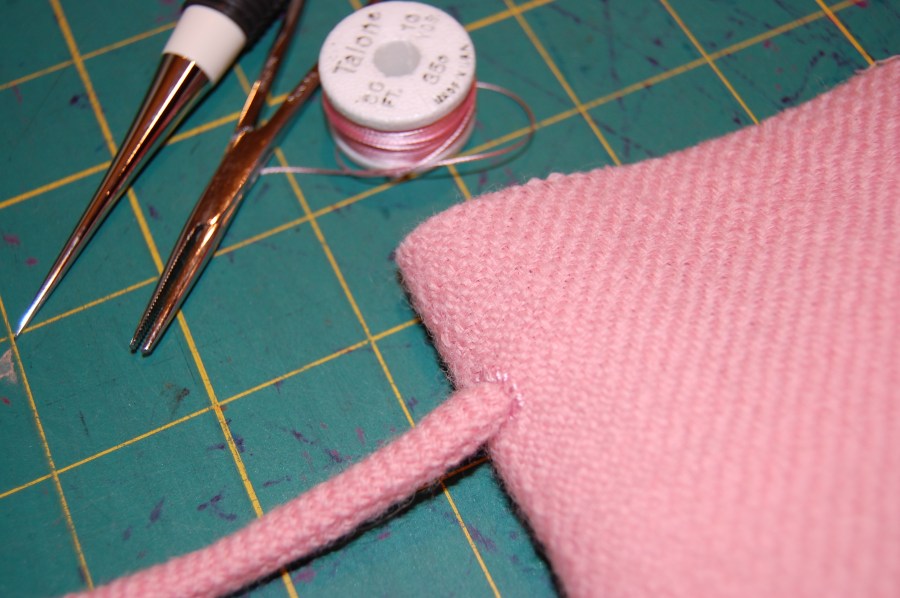 This shows the awl, the hemostat, and my spool of vintage pink silk buttonhole twist, along with a sample “insertion” of the loop.