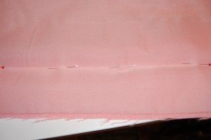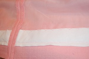 I then pinned about a half inch above the hem line, so I was able to remove the silk organza right at the hem fold. I then used a catch-stitch to secure the silk organza right along the fold line.