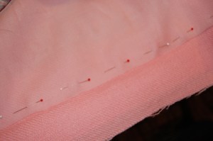 The pins mark the fold line of the hem; as you can see, the silk organza underlining extends to the bottom edge of the coat.