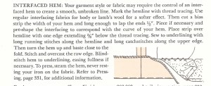 Doing this helped, but the hem was still not as soft as I thought it should be. Susan’s next suggestion was to add a bias strip of flannel to the interior of the hem, which I suspected was what I had needed to do from the start. I went to my trusty Vogue Sewing Book from 1970 to get guidance and found this: