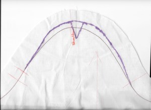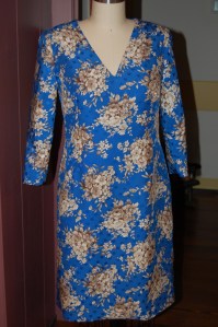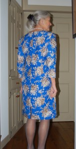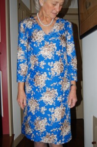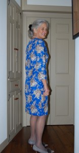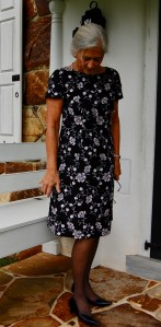 I bought this fabric thinking I would make a shirtwaist dress, but I couldn’t quite make it work in my mind. I thought I would like to emphasize the purple/deep lavender in it, although other colors are more dominant. I even found lavender buttons, but then thought they may be washed out by the other colors. But – seeing this dress being so effective with a grosgrain belt (again!) in a very non-dominant color, has given me all the confidence I need to take this future dress in the original direction I envisioned.