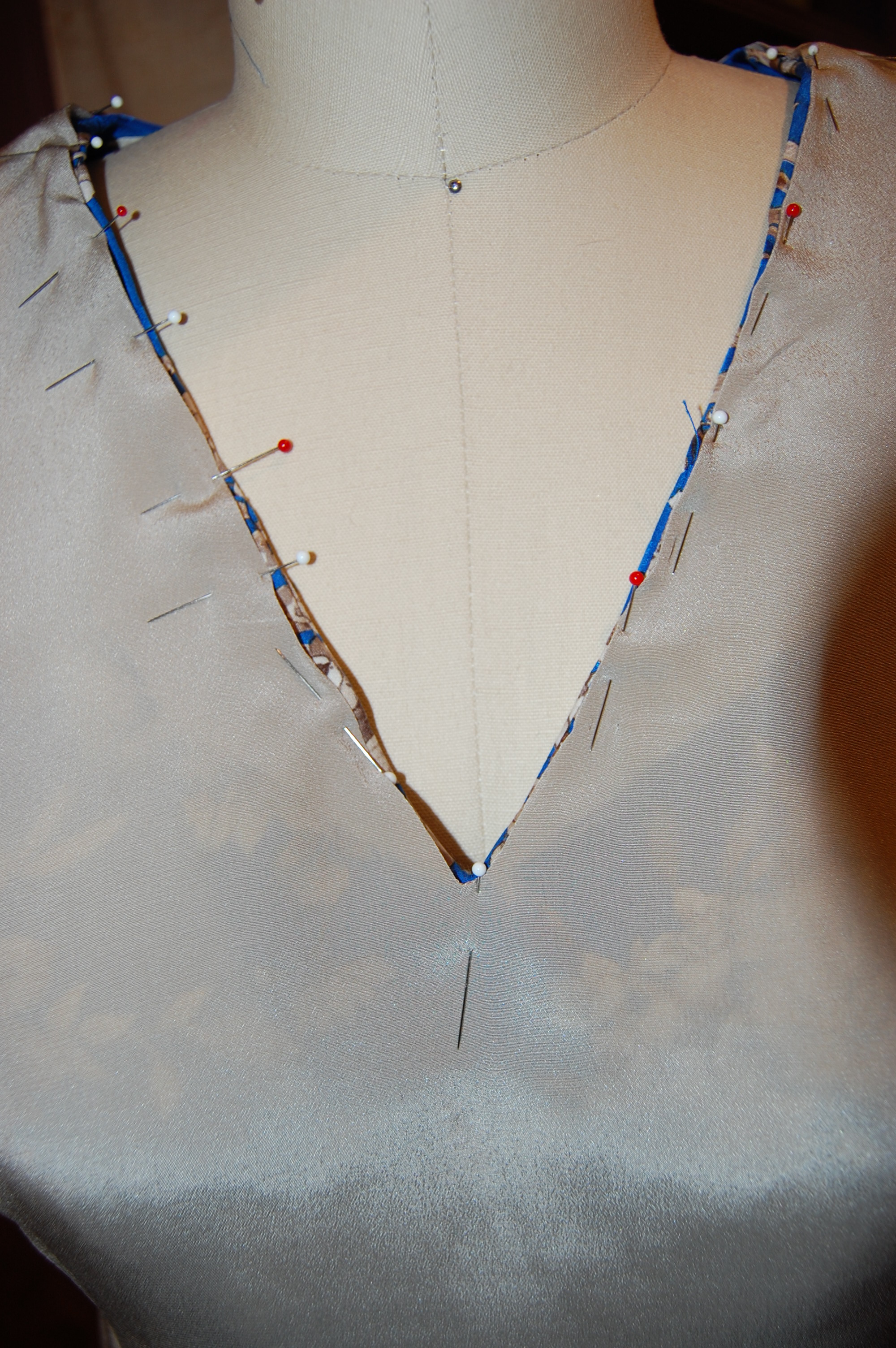 I chose a “mushroom” colored crepe de chine for my lining. Blues are very difficult to match as you know, so i decided a contrast color would be best. The lining fabric is from Emma One Sock Fabrics.