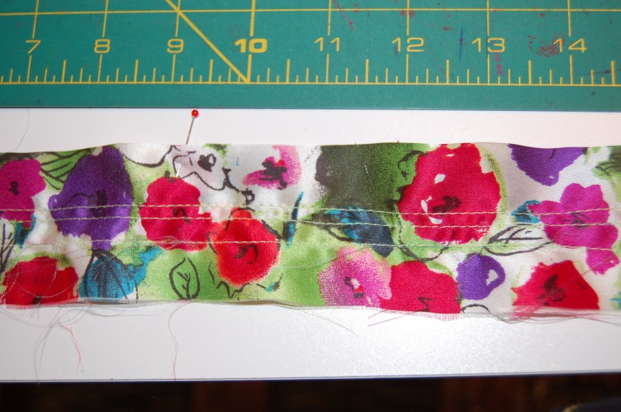 I decided on a 5/8″ wide ruffle. I cut my piece to be gathered 4.5″ wide, folded to 2.25″. I used three rows of gathering stitches.