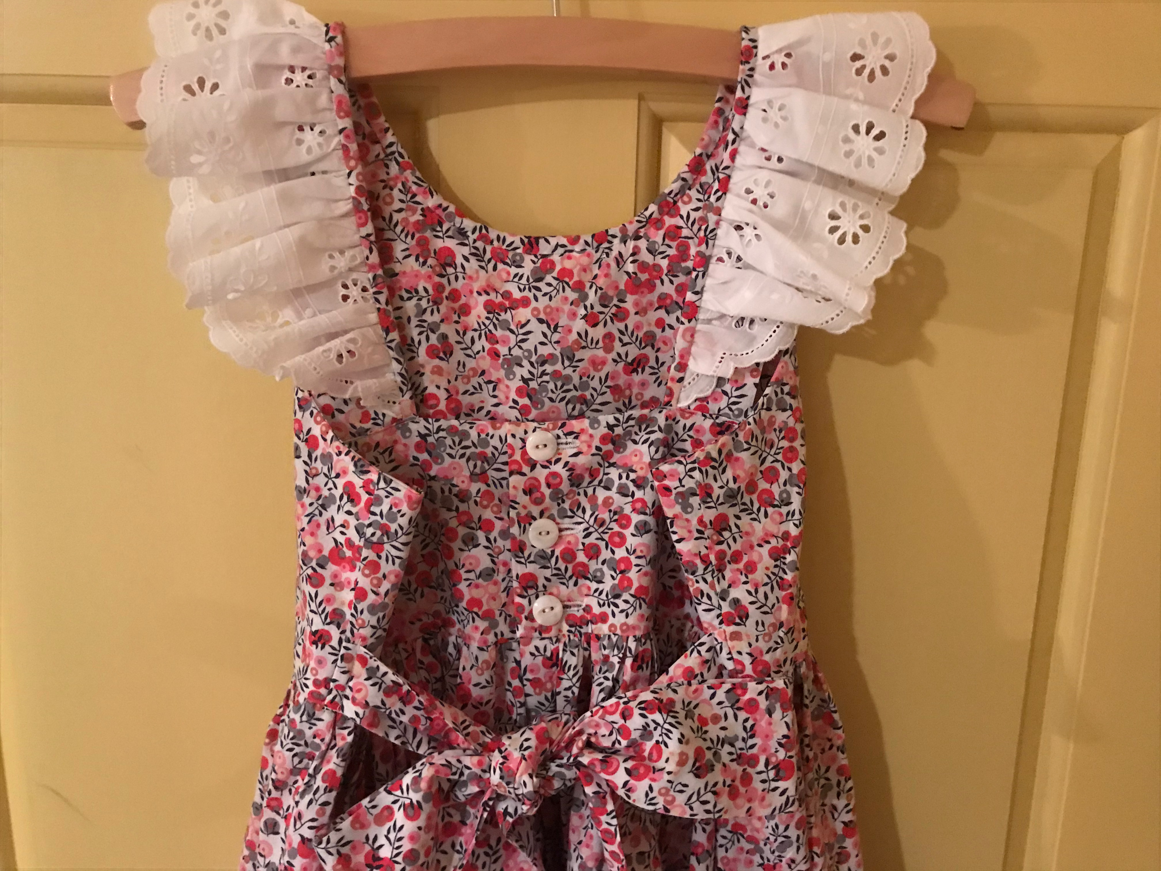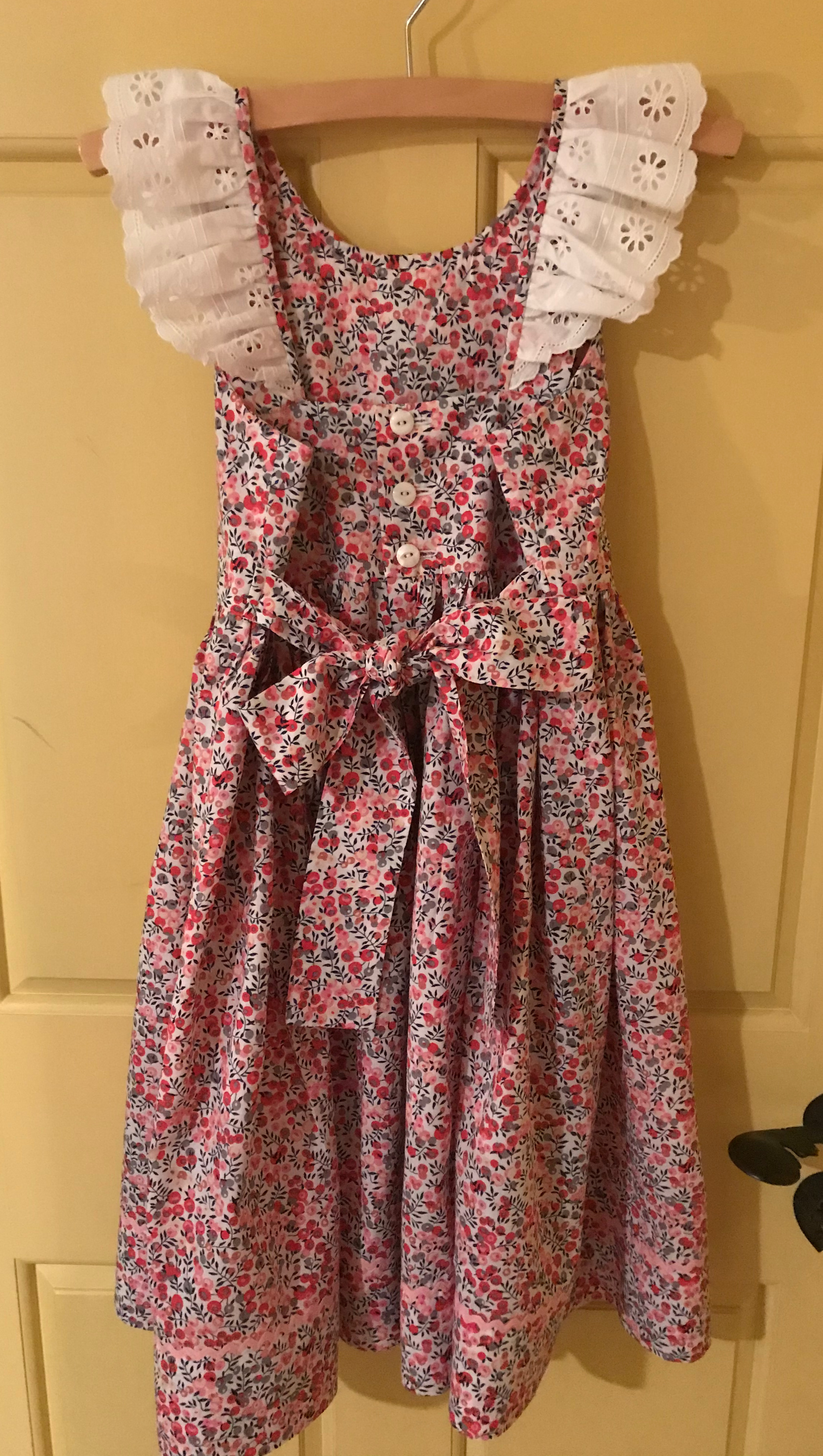 I found the fabric at Emma One Sock last Fall. It looks and feels like Liberty Lawn but is not. The bordered eyelet which I used for the collars is from Farmhouse Fabrics, as is the pattern, which I have used before. (This is the last year for this pattern for my girls, as I used the [largest] size 12 for my very tall and slender eight-year-old!)