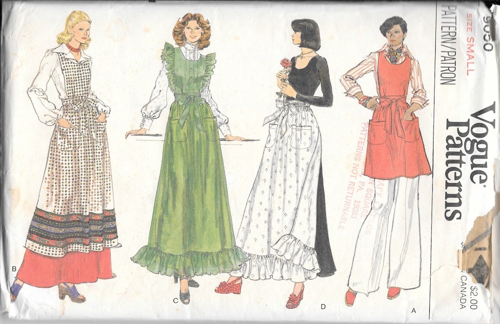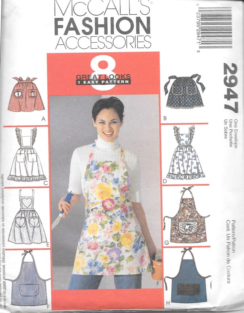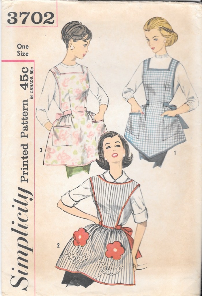 Seriously, who doesn’t love an apron?  They can be all-business or whimsical, pretty or frilly, plain or busy, colorful or monotone, practical or impractical.  The list goes on.  Fortunately I had three apron patterns already available to me, one from the 1950s, one from the 1970s and one more recent one, perhaps from the last 10 years or so, shown in order below.