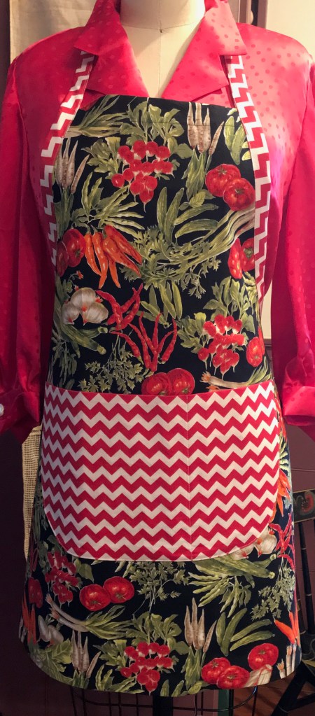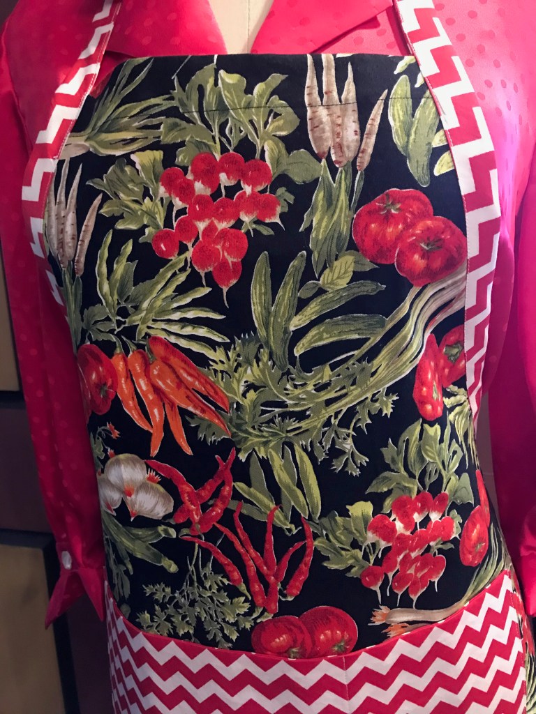 After making two aprons, I was having so much fun, I thought I would look and see what other apron-appropriate fabrics I could find stored away.  I came across a “vegetable” print which is from the 1980s or ‘90s, given to me by a sewing/quilting friend.  I had one yard which was perfect for the main part of the apron.  I stitched this one up in a flash, having perfected a few time-saving techniques in the first two aprons.