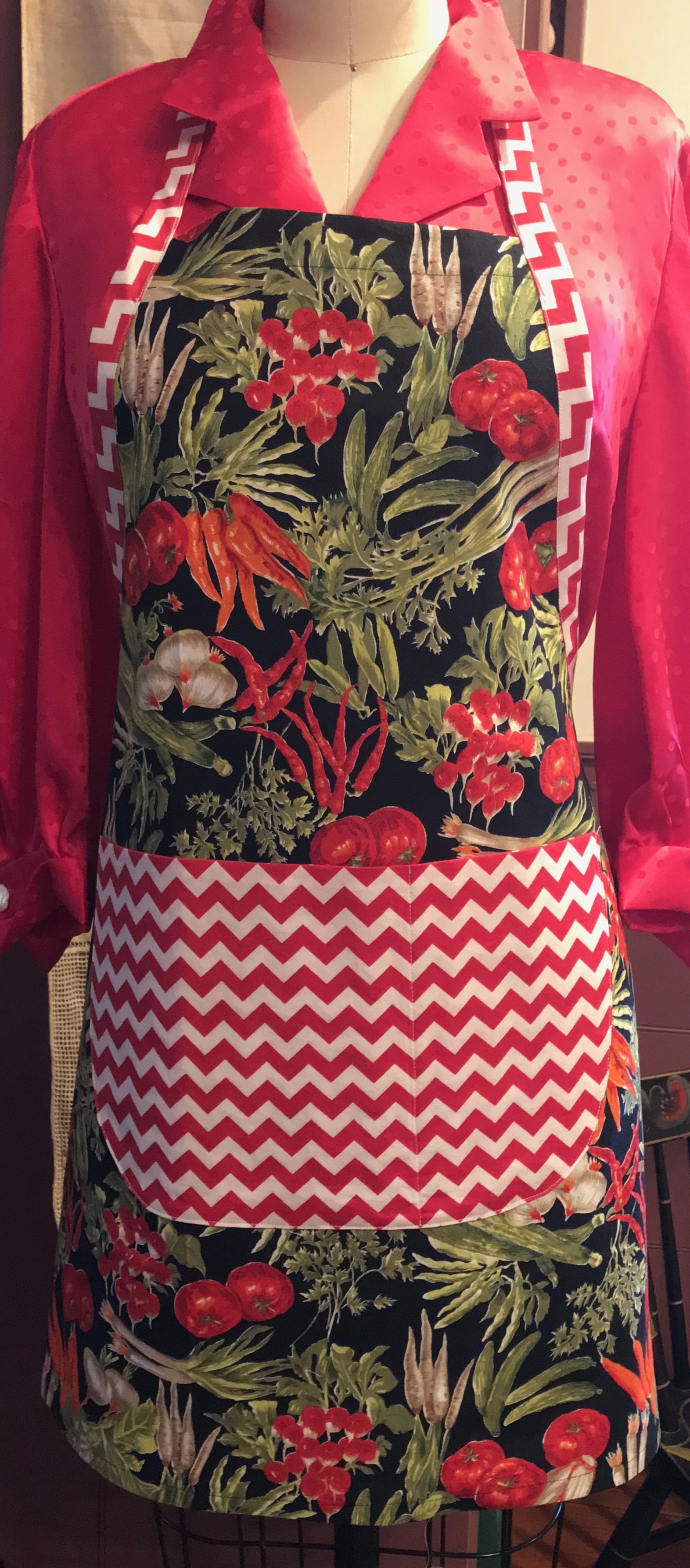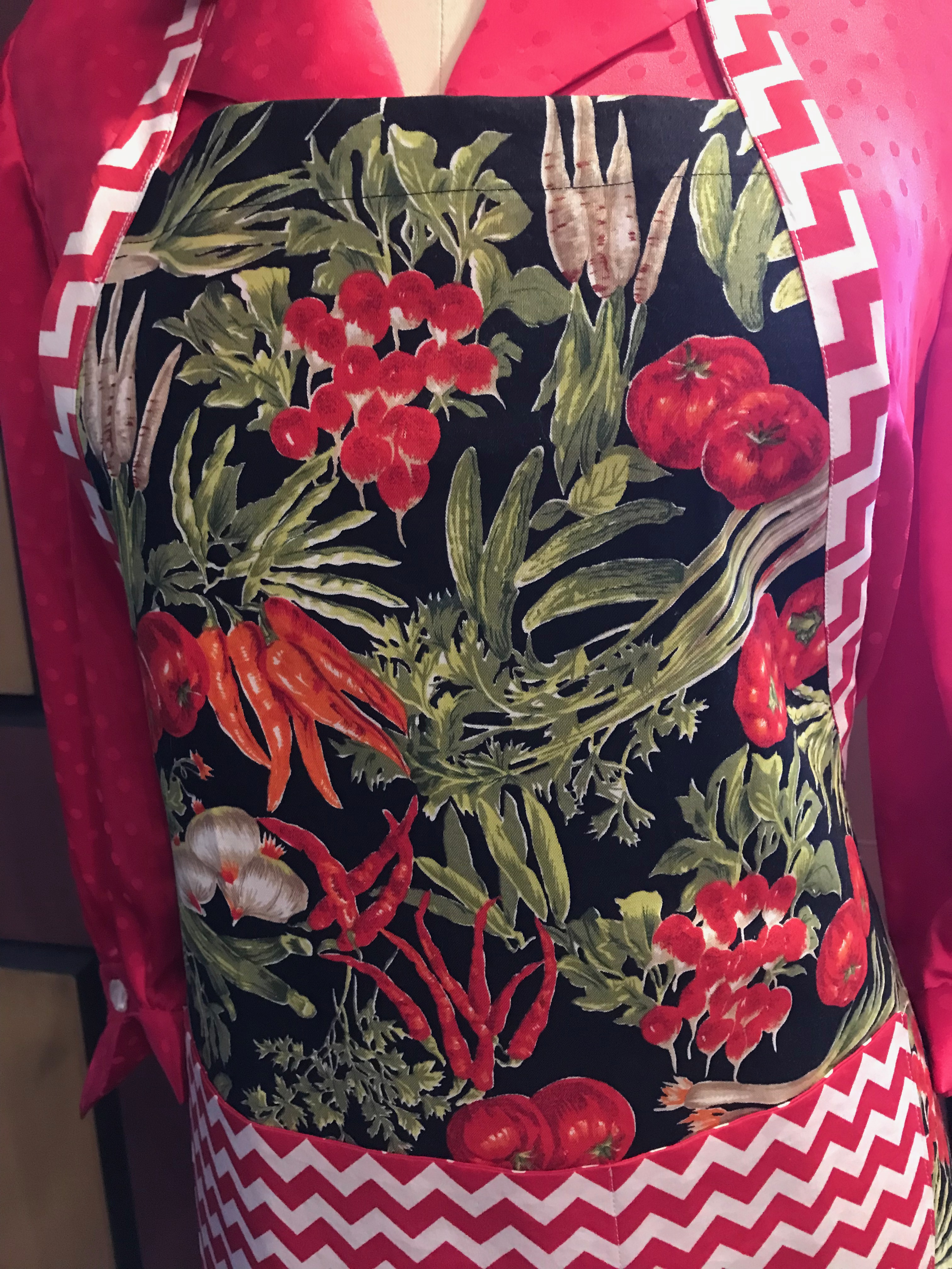 After making two aprons, I was having so much fun, I thought I would look and see what other apron-appropriate fabrics I could find stored away.  I came across a “vegetable” print which is from the 1980s or ‘90s, given to me by a sewing/quilting friend.  I had one yard which was perfect for the main part of the apron.  I stitched this one up in a flash, having perfected a few time-saving techniques in the first two aprons.