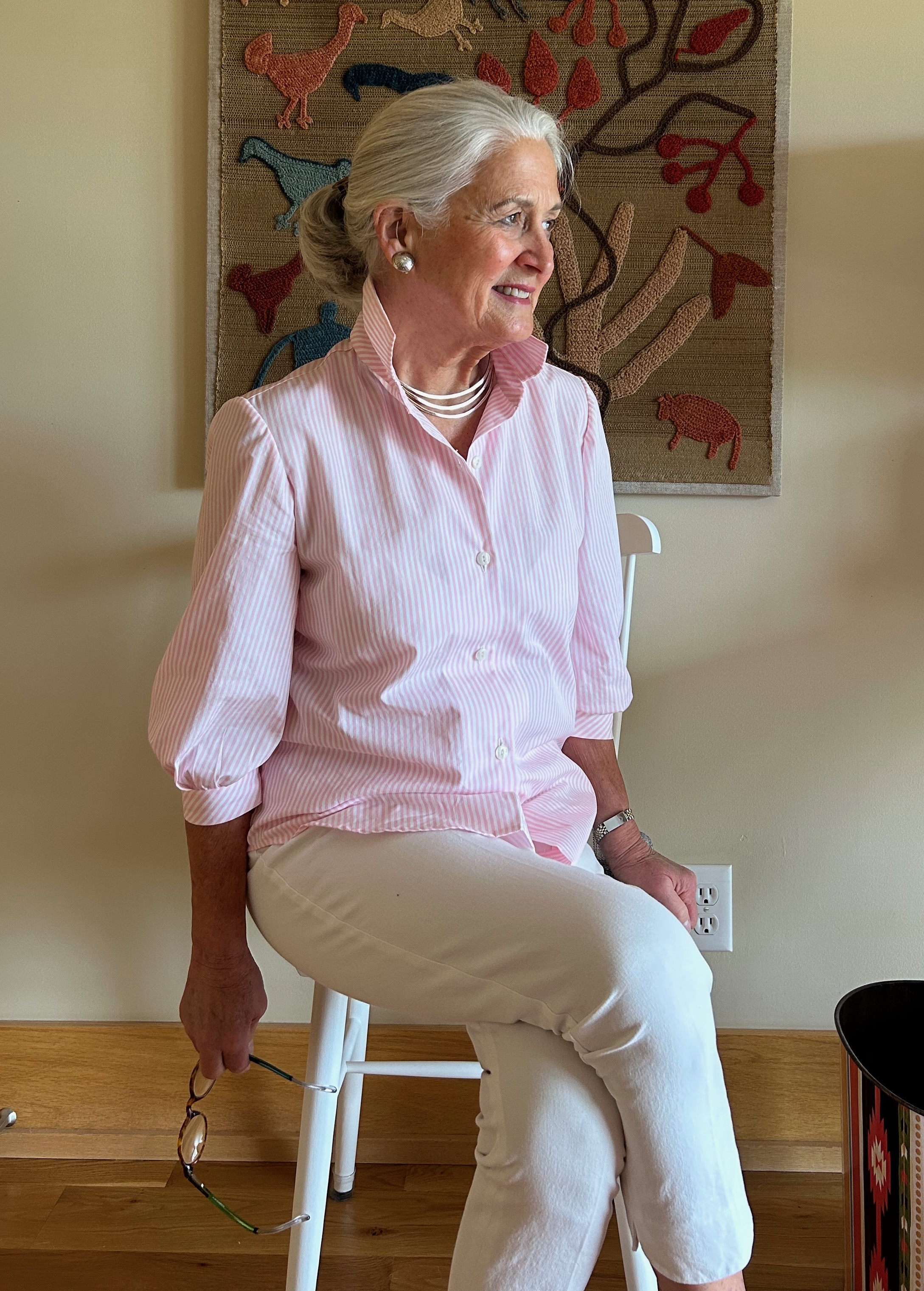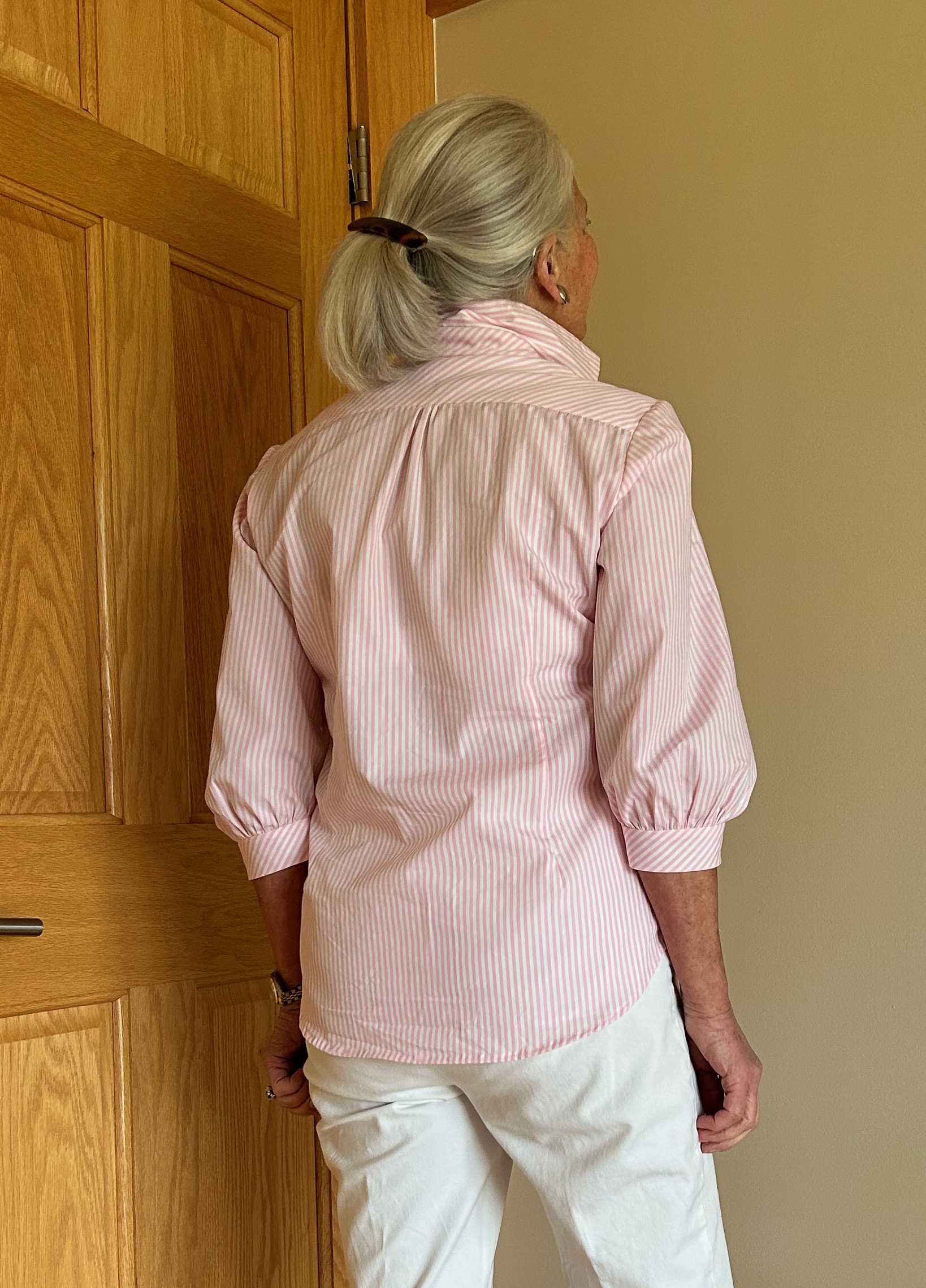 Your pink and white stripe blouse is the spring and summer equivalent of a valentine. Each part of it is just right, and it suits youl. Three-quarter sleeves are convenient and flattering, especially with your added bit of feminine poof.