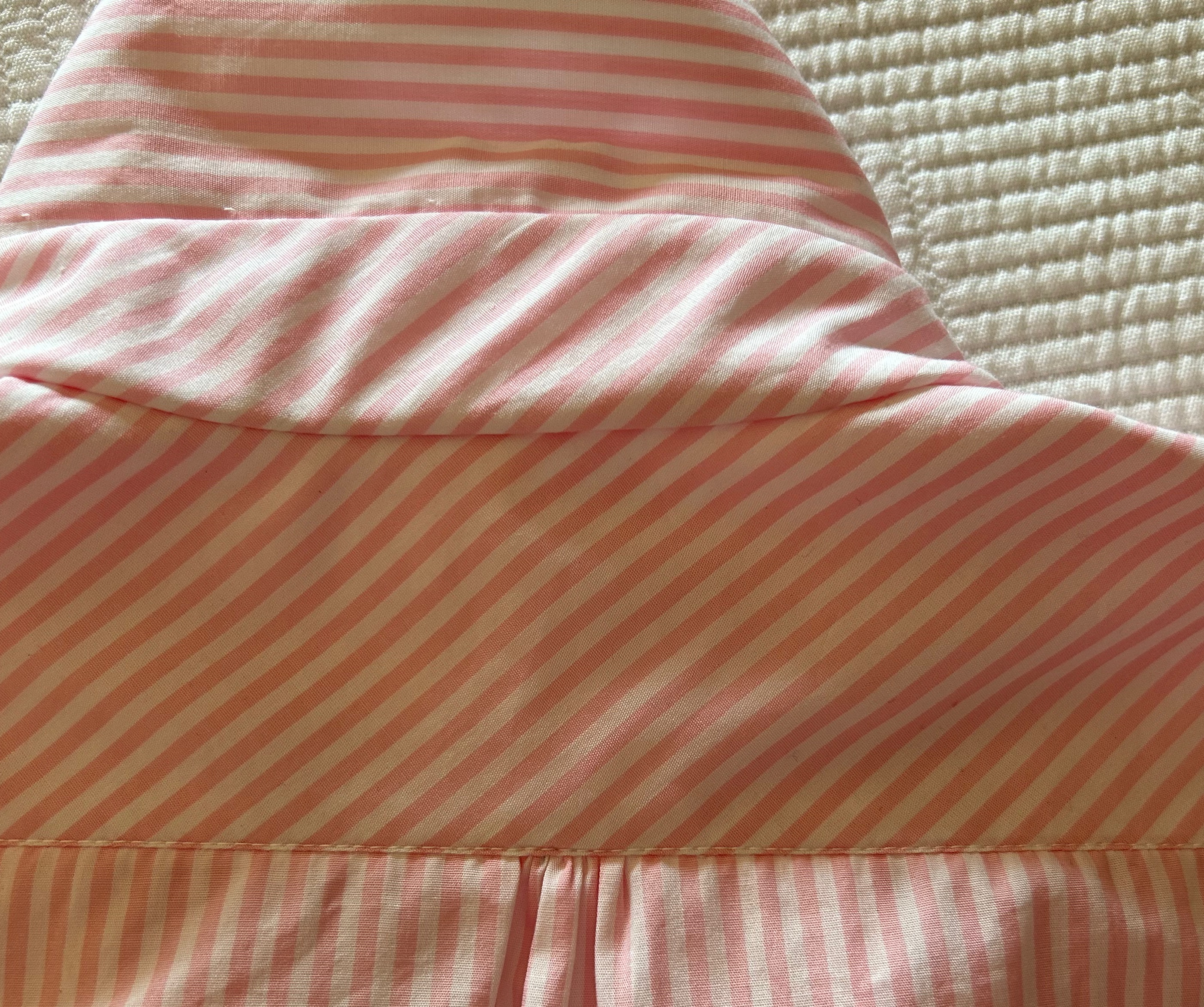 Once I had it in hand, I decided it would look a lot cuter with a contrasting collar and sash rather than the entire dresses out of the same fabric. That’s when I thought of the pink and white stripe I had stored away.