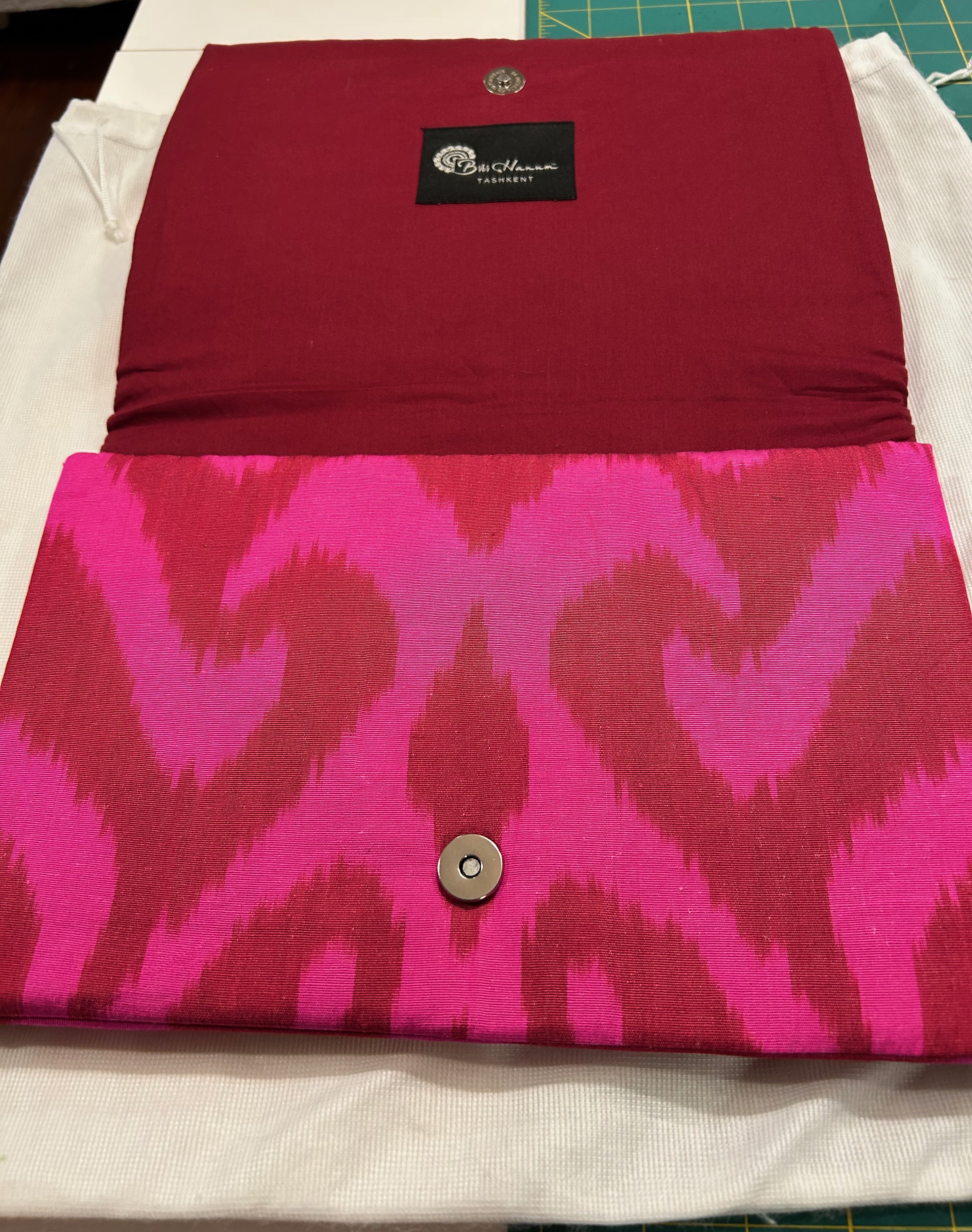 The pop-up shop accompanying this event was filled with gorgeous clothing, accessories, even shoes. When I saw this envelope clutch, I knew it would match my silk fabric perfectly and would be the perfect addition to my as-of-yet-to-be-sewn pink dress. Little did I know at that time it would be the catalyst to make sure I finished the dress!