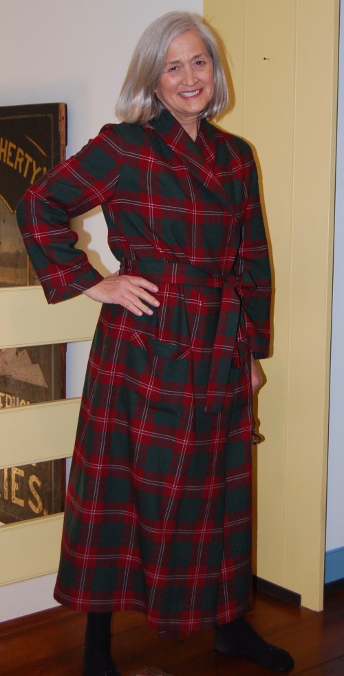 Pictures often are the best way to check fit on a garment (even after multiple try-ons to fine-tune it), and I was pleased with the final, slightly fitted, non-baggy appearance of this tunic. In other words, it does not look like a sack! It is easy to slip on, less so getting it off, but still very manageable. (Sometimes a side zipper can be – or needs to be – added to help with this task of dressing and undressing. The abbreviated length of this example precluded that option.)