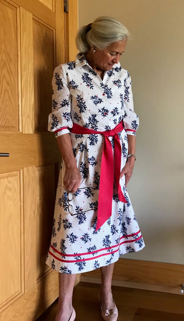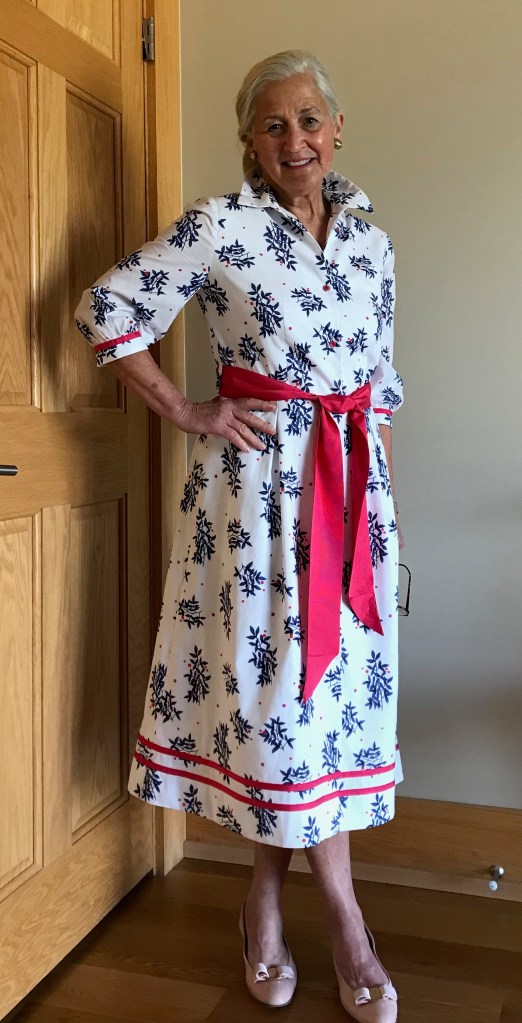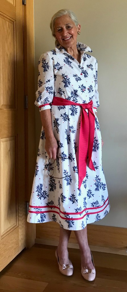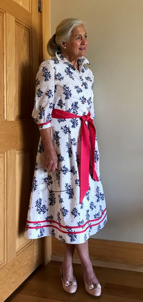 What was not as successful was the proper alignment of the buttons on the back belt to the center of the dress. That is one of the many downsides of fitting oneself – I could not see what I was doing, and although I measured and fiddled, I was still off by a couple of inches.