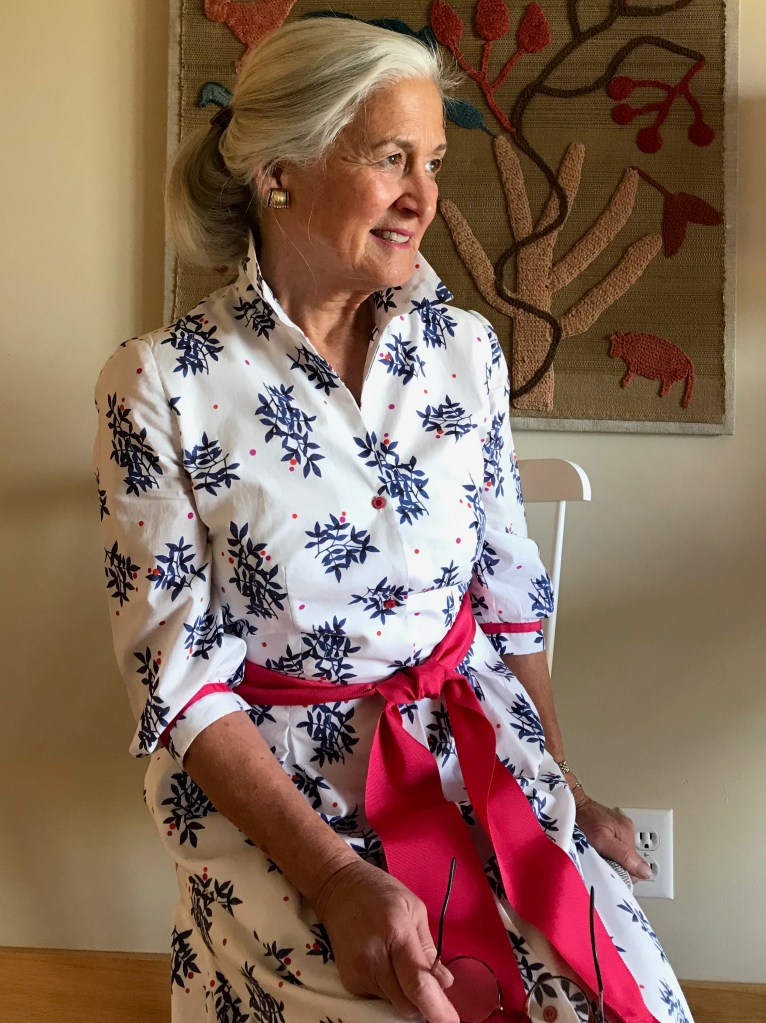 I like dress designs which have some “back“ interest, here the buttoned half belt. Although I loved the sleeveless view, I have become less comfortable wearing sleeveless dresses as I have gotten older. Thus, I was drawn to the short-sleeved view (C), knowing I could easily lengthen the sleeves to reach almost to the elbow, if that seemed the way to go. Thus, it was a logical progression to imagine the pink striped fabric made up in this design, despite the note on the pattern “Not suitable for striped fabrics.”