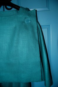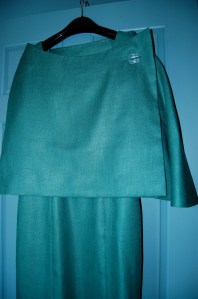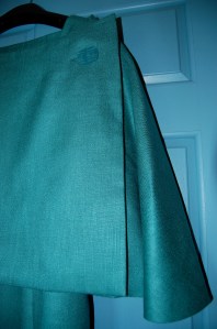 I purchased the Pucci pattern for the dress (which I now believe to be too “youthful” for me), but its cape certainly completes the outfit. The description reads: “…Cape with jewel neckline has arm openings in side front seams; back vent [which I find interesting}. Top-stitch trim.”