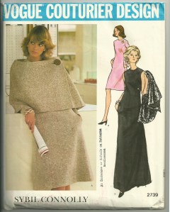 And the final cape pattern I own – almost a capelet – is this Sybil Connolly design. The caption states “…Short asymmetrical flared cape has side button closing.” No arm slits in this cape.