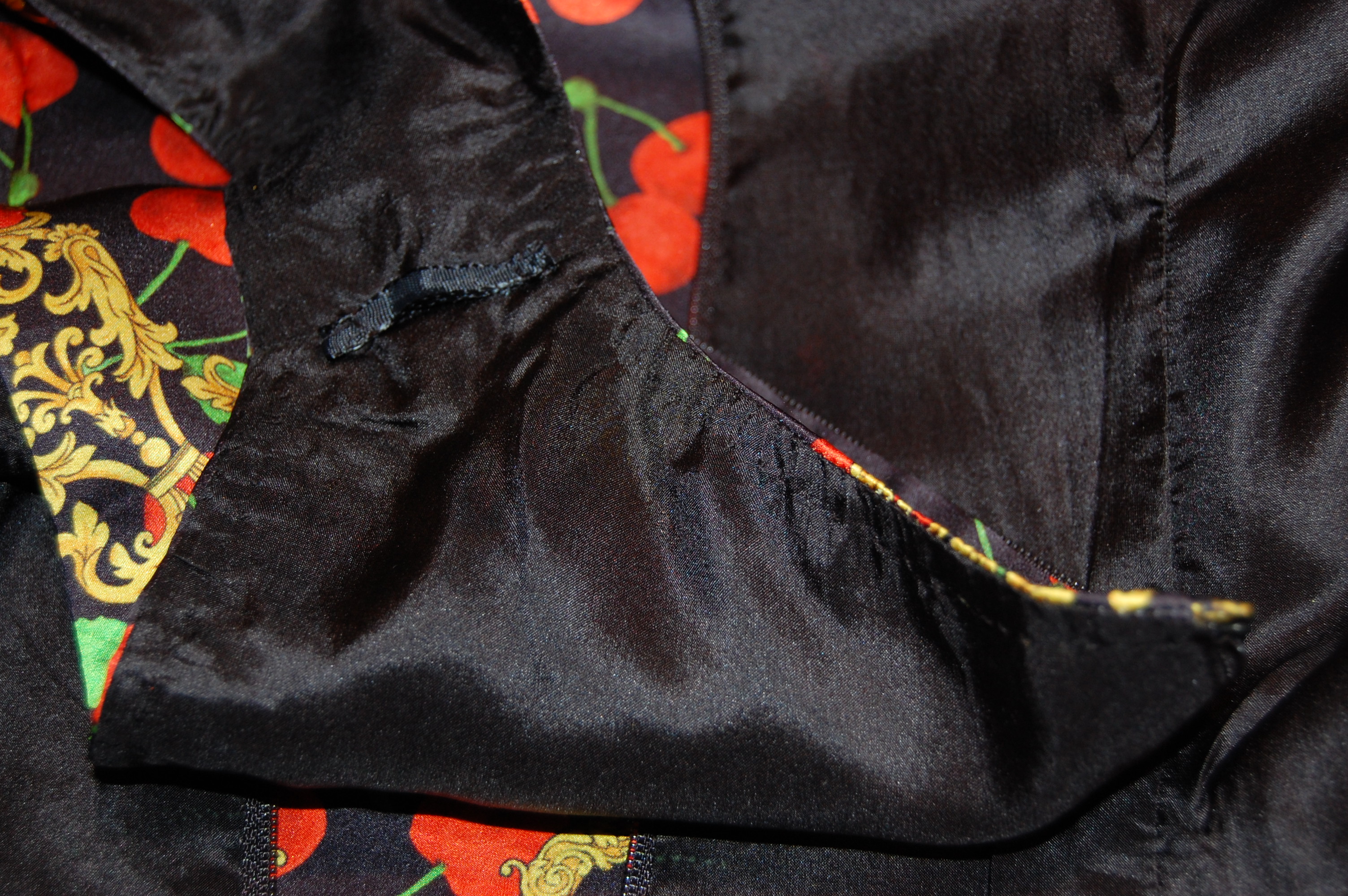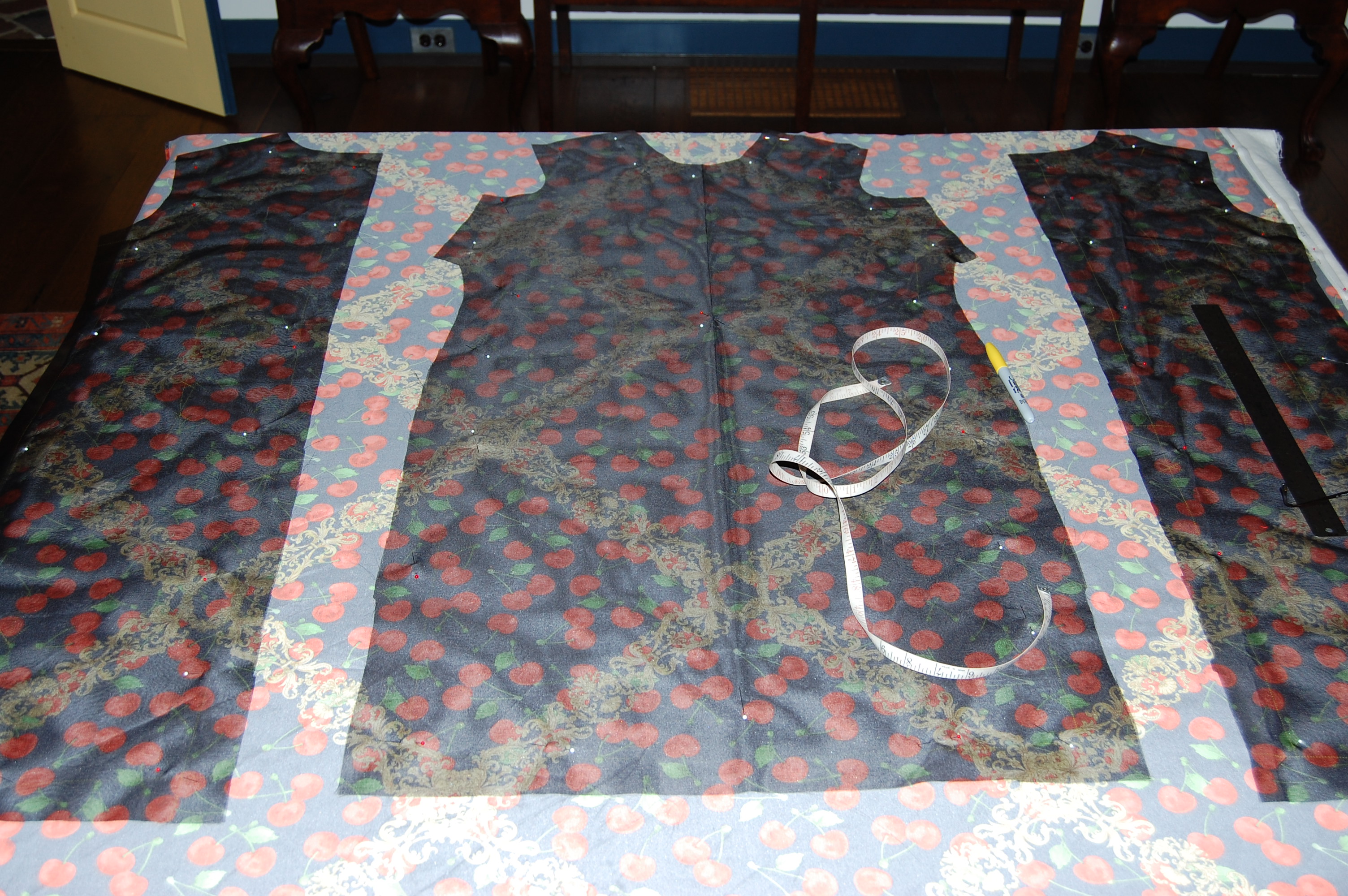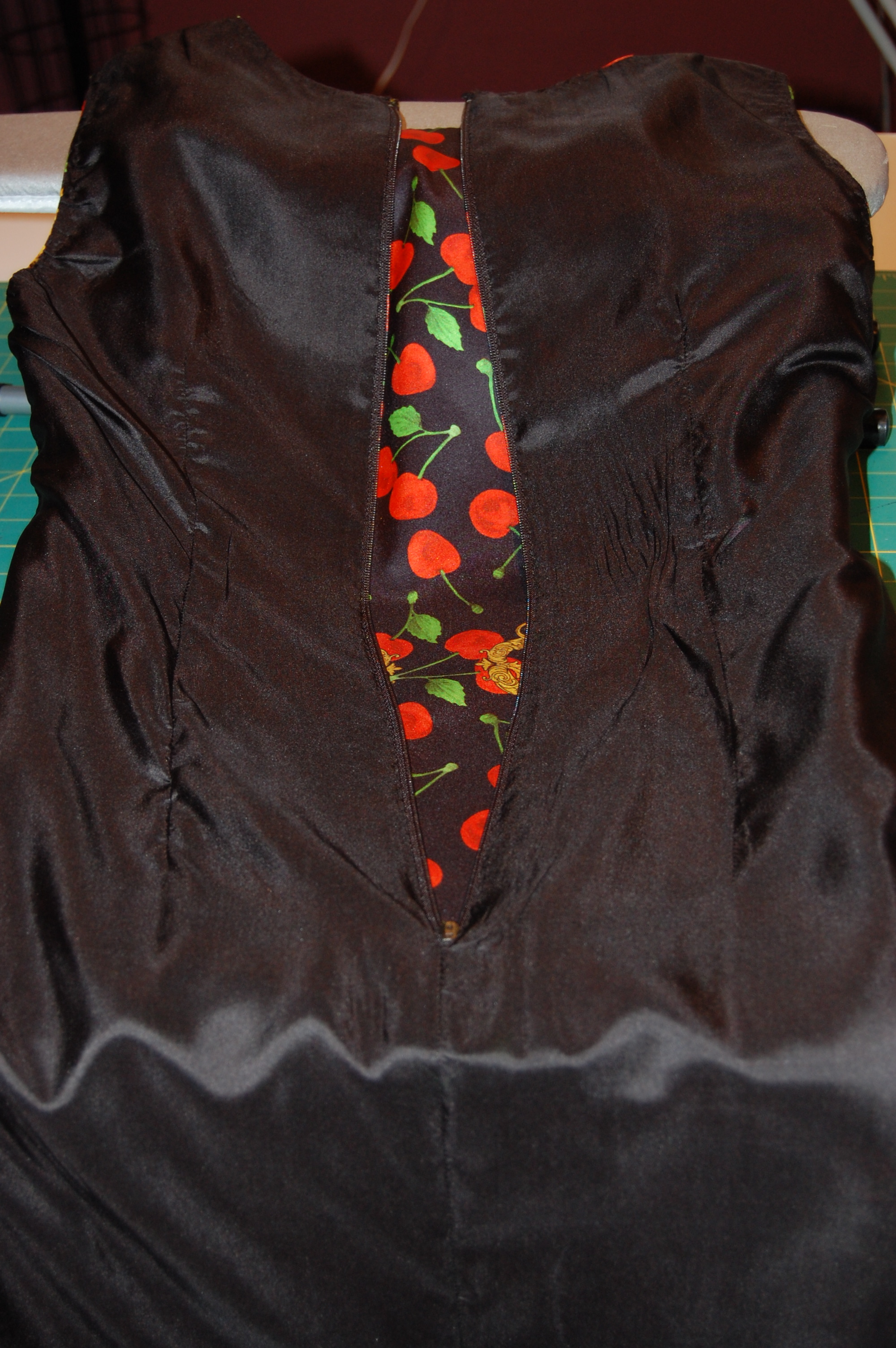 The pattern called for the fashion fabric to be underlined, but not lined. I wanted to line the dress – and actually felt it was a necessity with the fabric I was using. Because of the unusual construction of the dress, I knew that this was going to be interesting – and that I was going to have to make it up as I went. To see what I mean about the unusual construction, take a look at the pattern instructions. The front of the “underdress” is sewn to the back of the dress at the side seams only to the waistline. The bodice part of the front “underdress” hangs loose while the two sections of the overblouse are first sewn to the dress back. Then that bodice is hand sewn in place.