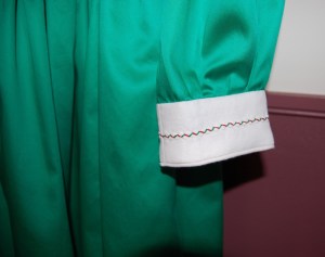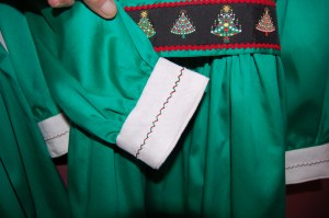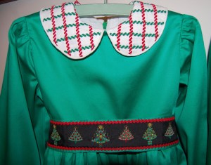 Although I wasn’t planning on smocking these dresses, I knew I could embellish the collars and cuffs in the same manner as the illustrated dress. Of course, I envisioned red and green rickrack crisscrossed, and red and green detailing on the cuffs.