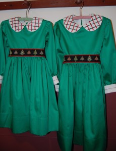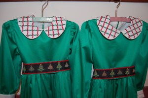Last year’s dresses were red and white checked flannel, so this year I thought they should have green dresses. Trying to find a pretty “Christmas green” in a child-appropriate fabric proved to be a challenge. Thankfully, on a trip to North Carolina in October, I had the good fortune to visit Mulberry Silks in Carrboro. There I was able to order a lovely green cotton sateen from a swatch book, and have it sent to my home in Pennsylvania a couple of weeks later.
