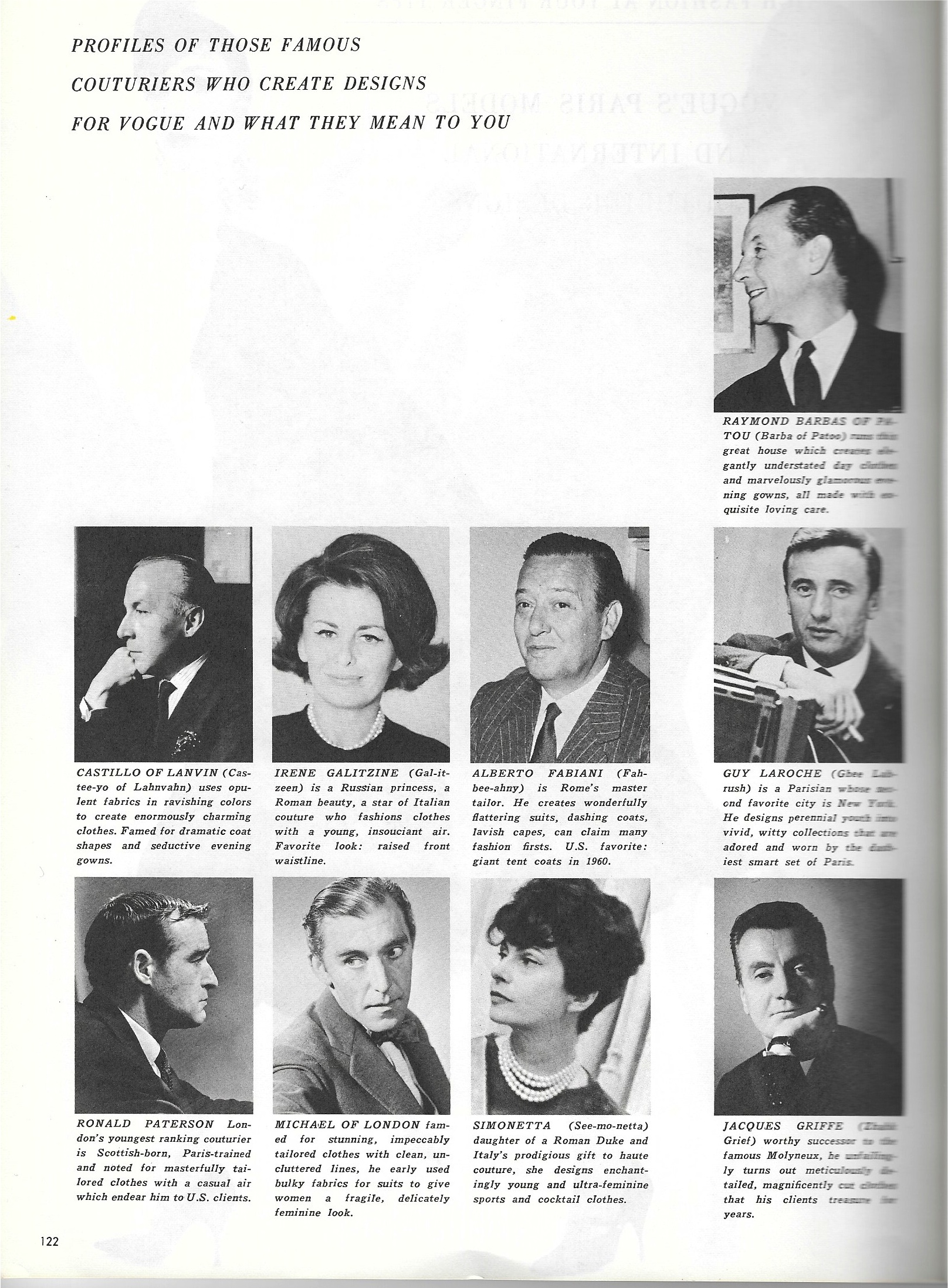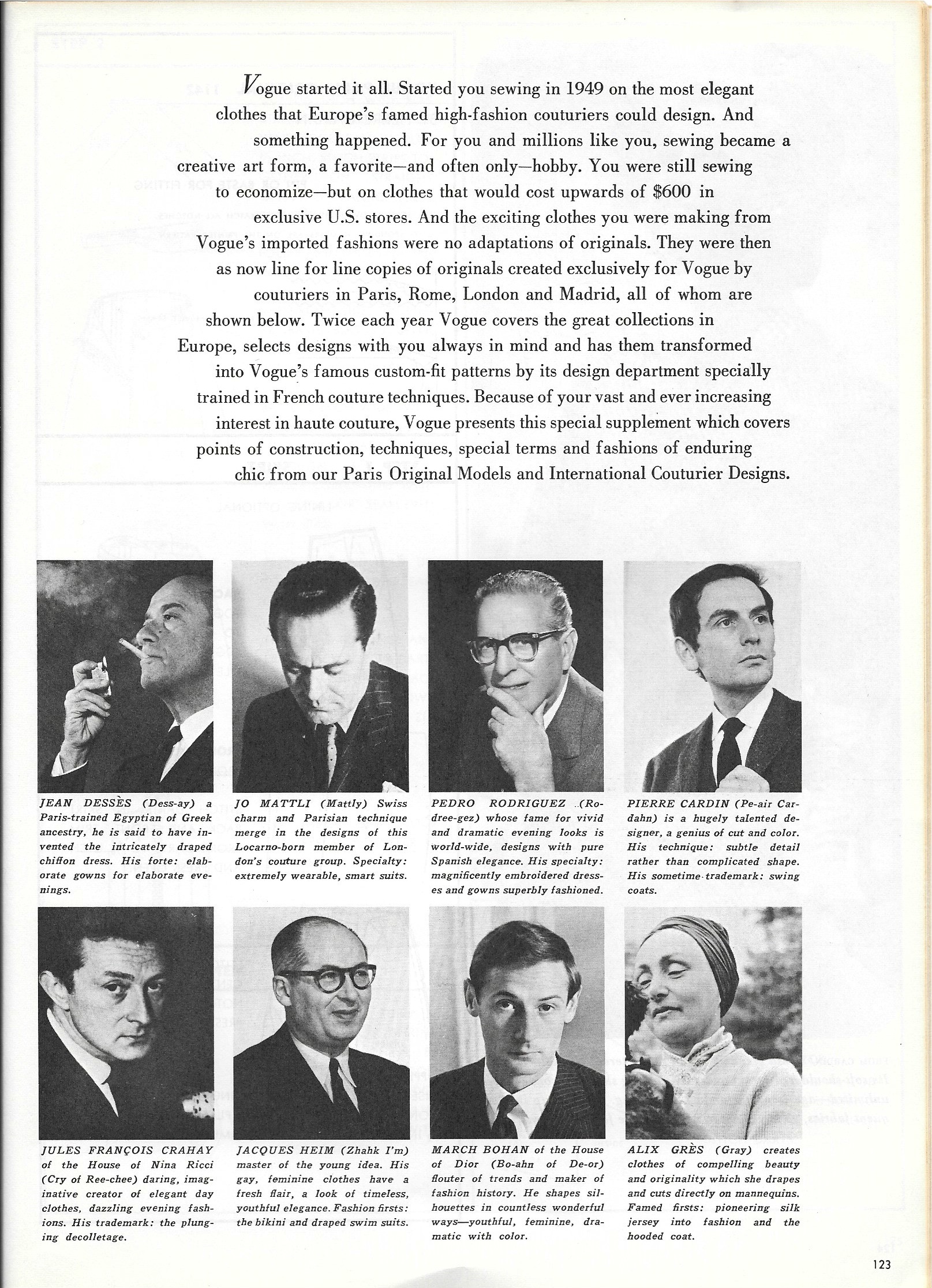 The New Vogue Sewing Book published in 1963 contained a “Couturier Supplement”. According to the Foreword in this magazine-styled book, “Only Vogue Patterns can bring you original designs from the Paris and International Couture houses, because of an exclusive arrangement with world famous designers.” One of the 17 designers featured in the supplement was Jo Mattli.
