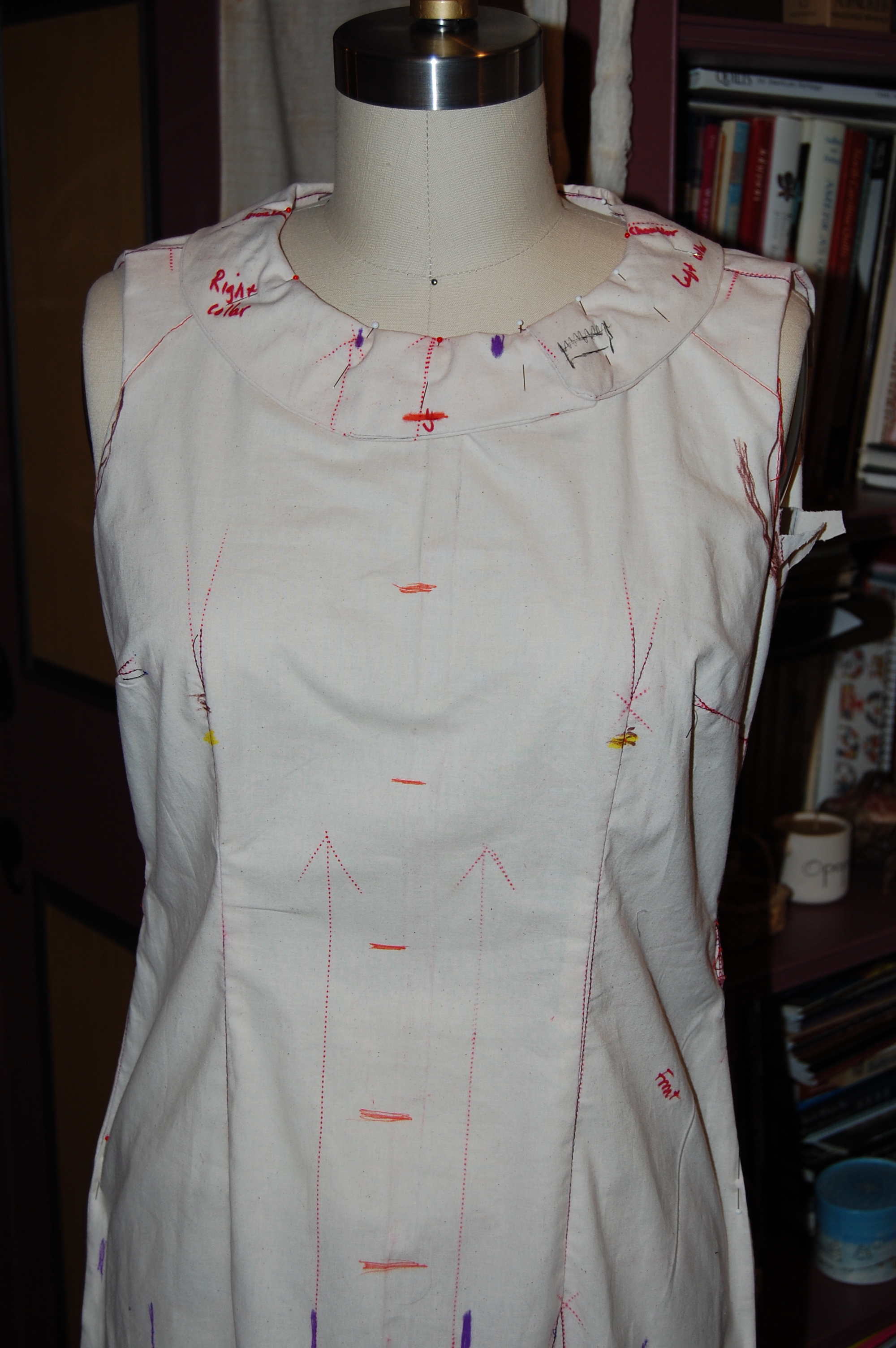 While the Mattli-designed jacket in my suit dress ensemble is certainly the star of the outfit, I am hoping the dress will have its own charms. After being out of town and away from my sewing all last week, I have now been able to turn my attention to the dress part of the outfit. I believe I have successfully combined two patterns (sheath dress and collared blouse) to create – what else? – a collared sheath!