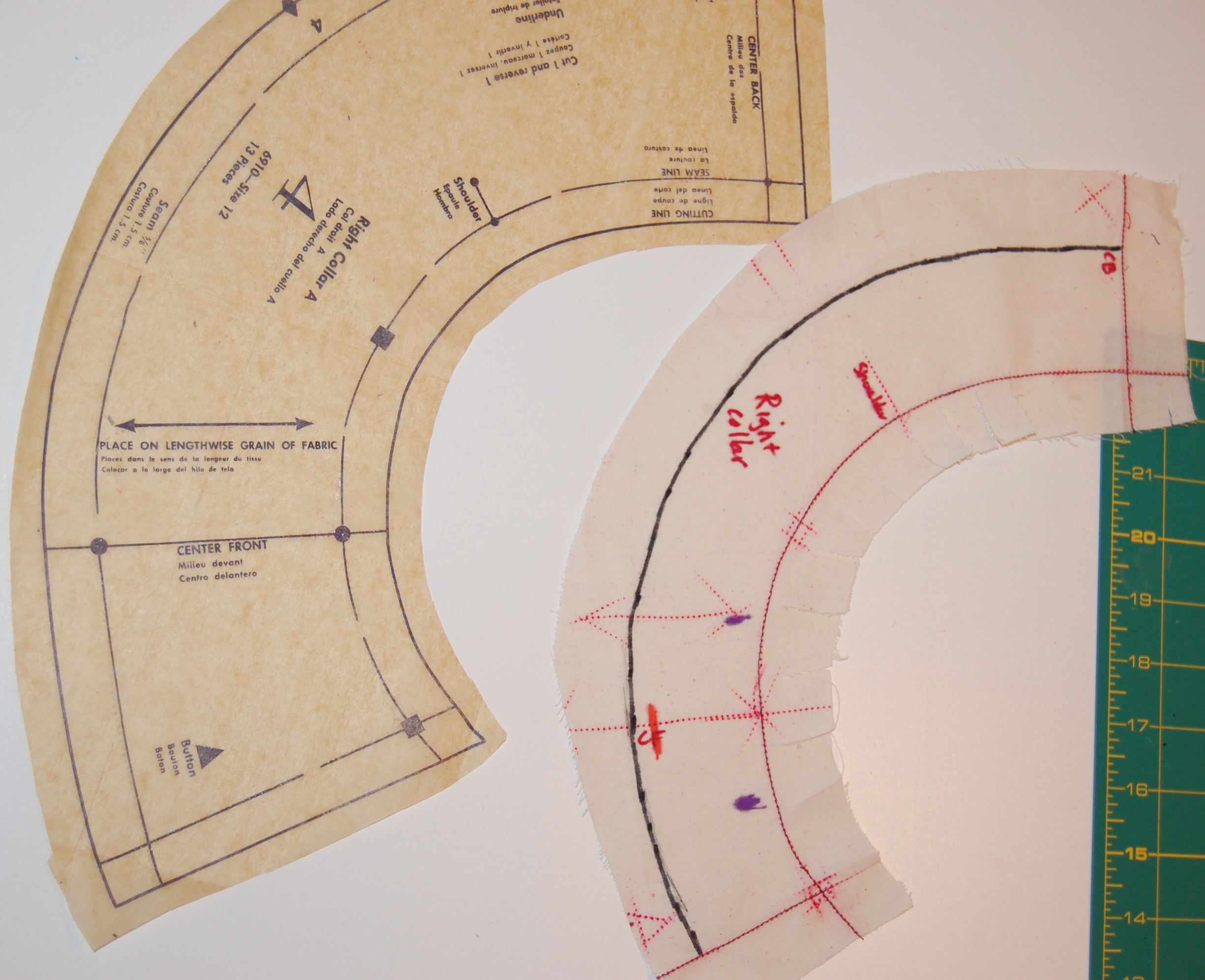 This shows not only the added curve to the left collar end, but also how much width I had to remove from the collar pattern.