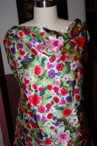 I quickly determined there was no way I could get the dress I wanted by placing the pattern on the lengthwise straight-of-grain. The flare of the skirt, which I wanted to be mid-calf, precluded any notion of such a layout. At 45” wide, I knew I could just get the dress length I wanted if I laid out the pattern on the cross-grain, from selvedge to selvedge. Linen is a very stable fabric, so I was confident the cross-grain would work. In addition, there were no directional limitations in the floral design of the fabric. Barely fitting my pattern – from shoulder to hem – on the fabric from selvedge to selvedge, however, would leave no extra fabric to turn up for the hem – or even to face the hem. I decided to worry about that later. First I wanted to determine how I could get the four pieces for the dress and the two lengthened sleeves placed on the fabric, keeping in mind three important things: 1) although this was not a fabric to be matched per se, the all-over design of the fabric needed to be on the same plane in contiguous seams; 2) I wanted to space out the larger floral motifs so the dress would be balanced as best as possible (looking critically at the dress I made when I was 23, I clearly could have given this more thought!); and 3) I wanted to avoid large demonstrative blooms at the bust. Then, and only then, would I worry about the hem.