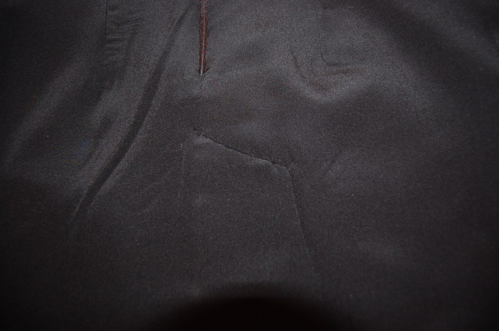 I lined the dress in black silk crepe de chine. (I find almost all my lining silk at Emma One Sock.) When it came to the kick pleat, I found that a slanted seam below the end of the zipper was necessary to divide the lining between the two sides of the kick pleat.