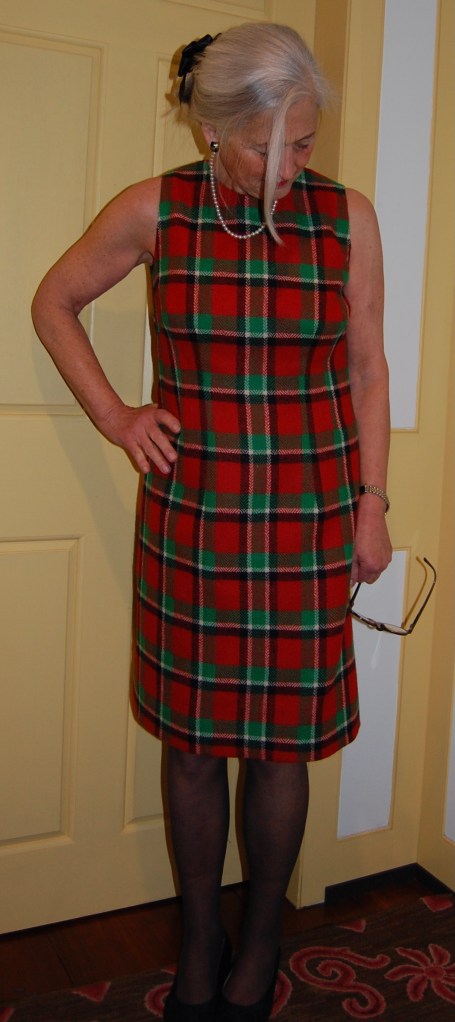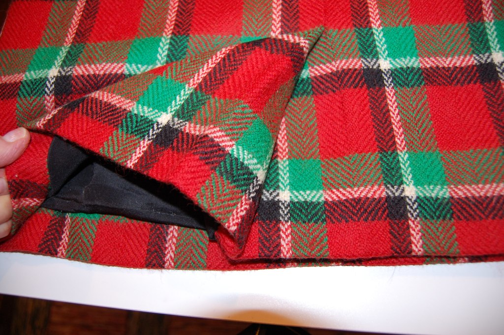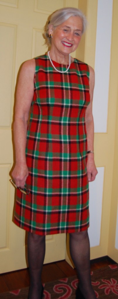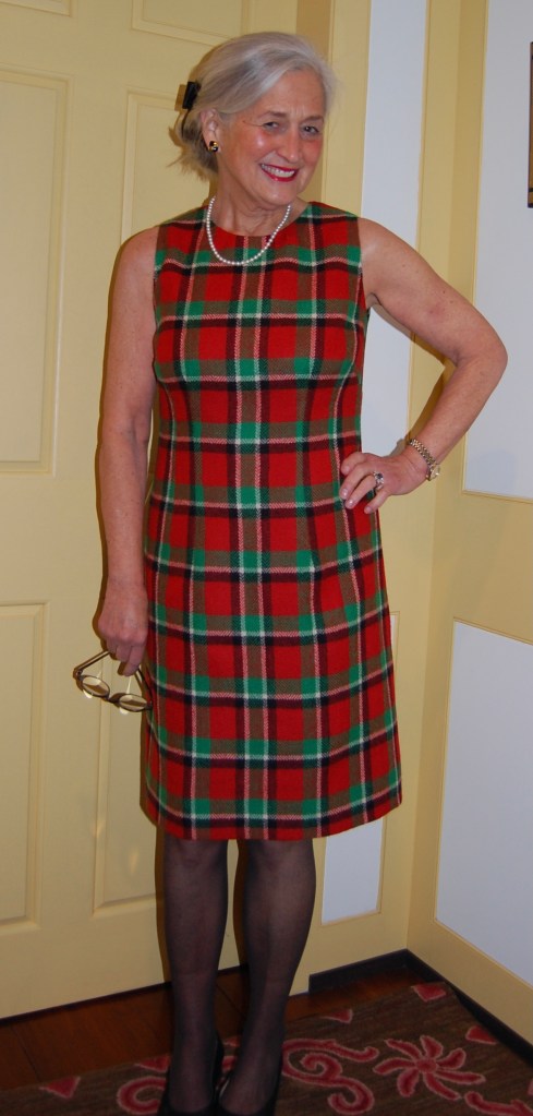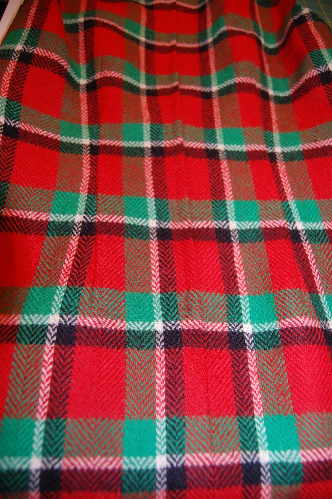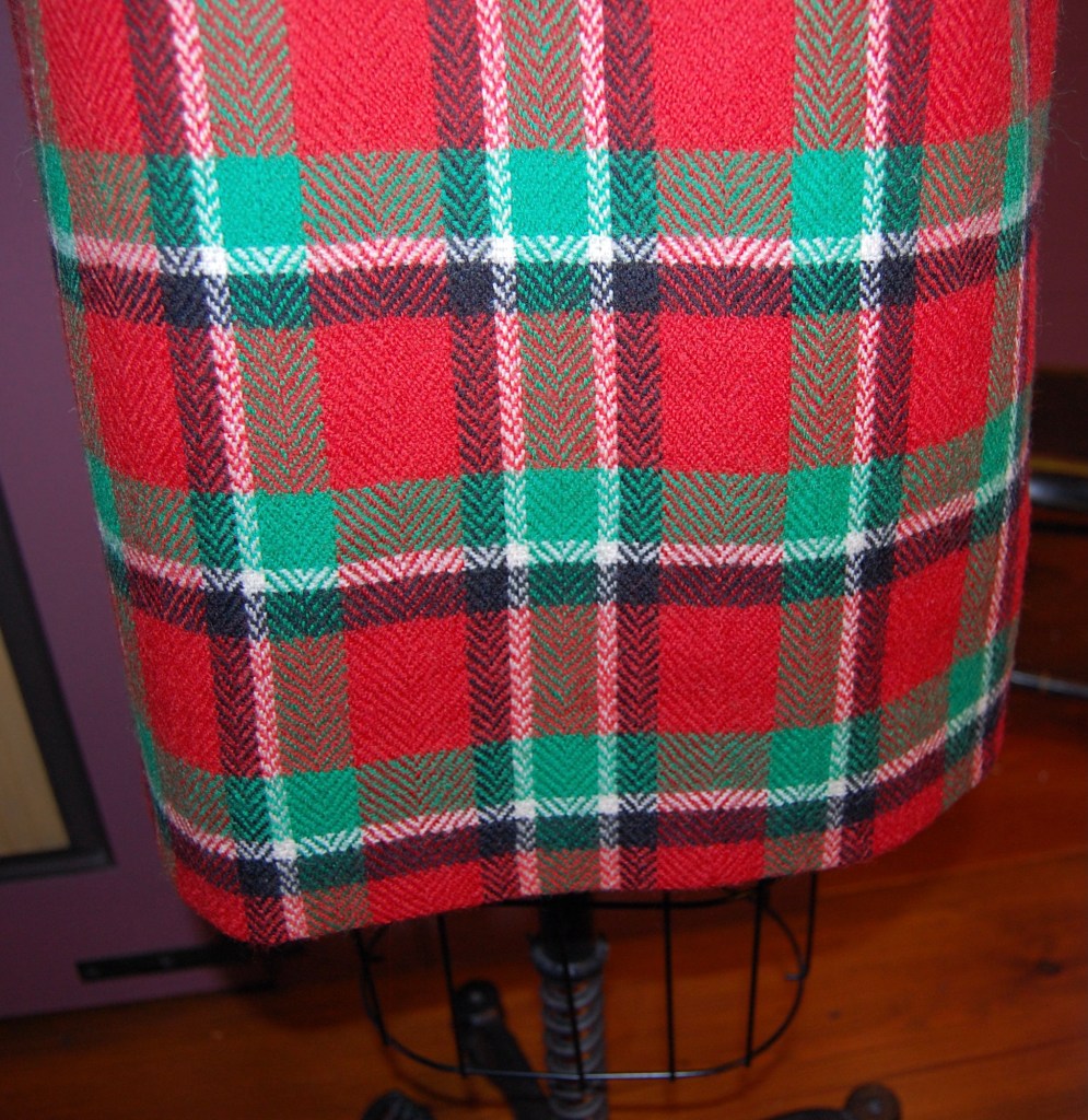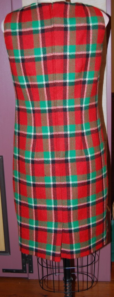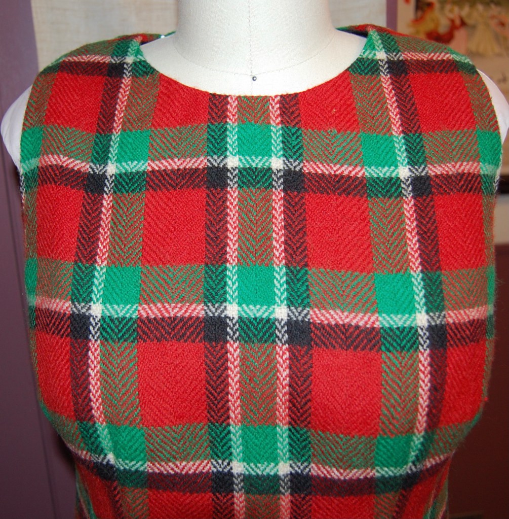 Having only 1.25 yards of this vintage wool restricted my options to either a simple sheath dress or a skirt. I opted for the sheath, with all good intentions of using the princess-lined pattern I had recently used for a pink dress in vintage Linton wool. In fact, one of the reasons I made the pink dress was to see if I would be able to successfully match plaids when I started on the red/green wool. (The weave of the pink Linton has a plaid woven into it, which I knew would be helpful to me in determining the pattern’s useability for a multi-color plaid.) Only one problem – when I laid out the pattern pieces on the Forstmann wool, I didn’t have enough fabric. I should have realized that the 7-panel princess dress would take more fabric than I had – and this time there was no making it work.