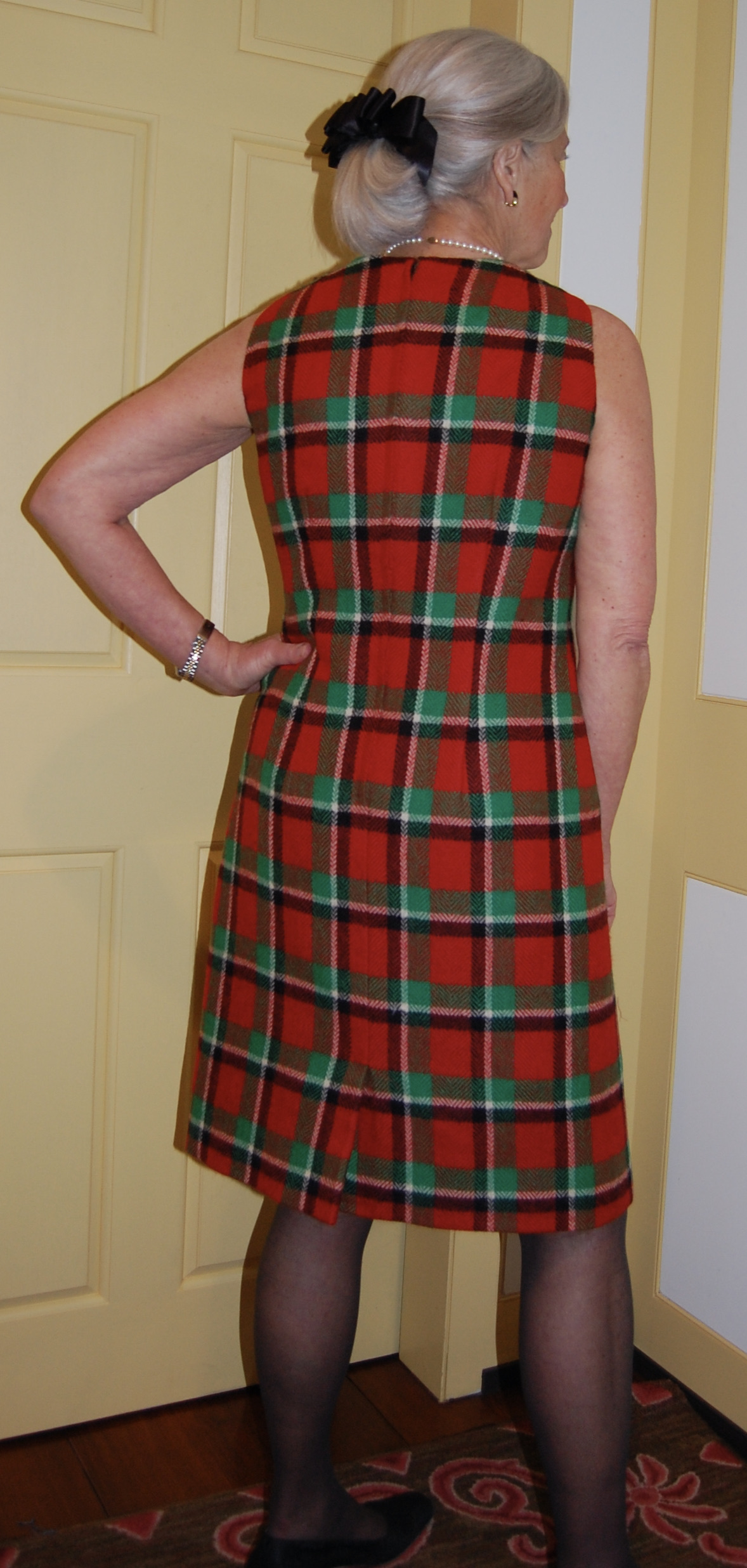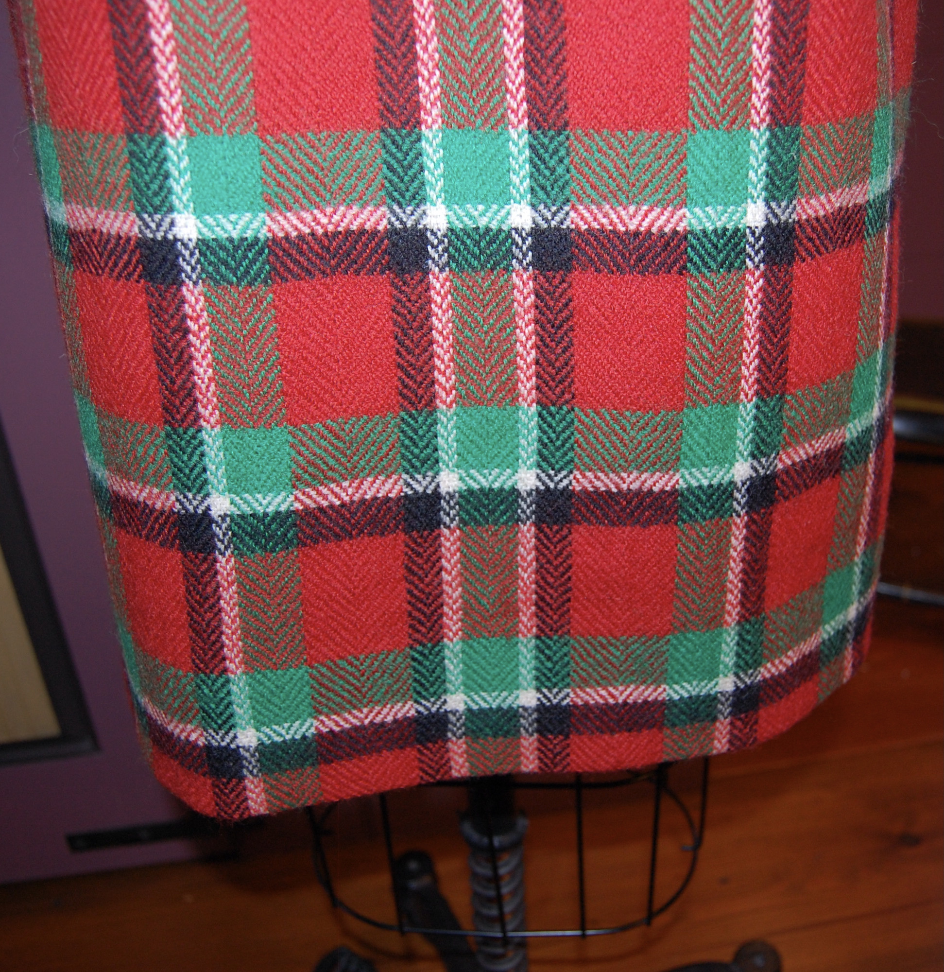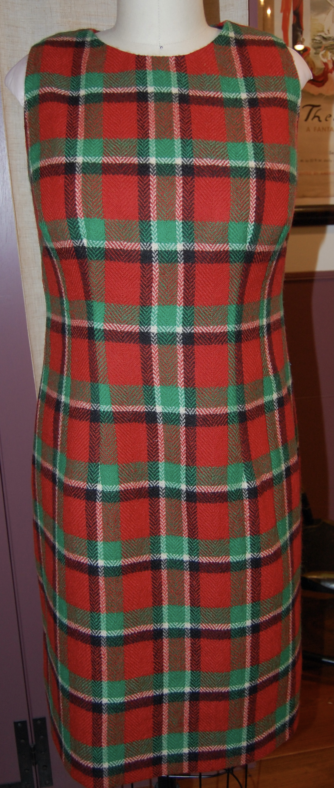 Having only 1.25 yards of this vintage wool restricted my options to either a simple sheath dress or a skirt. I opted for the sheath, with all good intentions of using the princess-lined pattern I had recently used for a pink dress in vintage Linton wool. In fact, one of the reasons I made the pink dress was to see if I would be able to successfully match plaids when I started on the red/green wool. (The weave of the pink Linton has a plaid woven into it, which I knew would be helpful to me in determining the pattern’s useability for a multi-color plaid.) Only one problem – when I laid out the pattern pieces on the Forstmann wool, I didn’t have enough fabric. I should have realized that the 7-panel princess dress would take more fabric than I had – and this time there was no making it work.