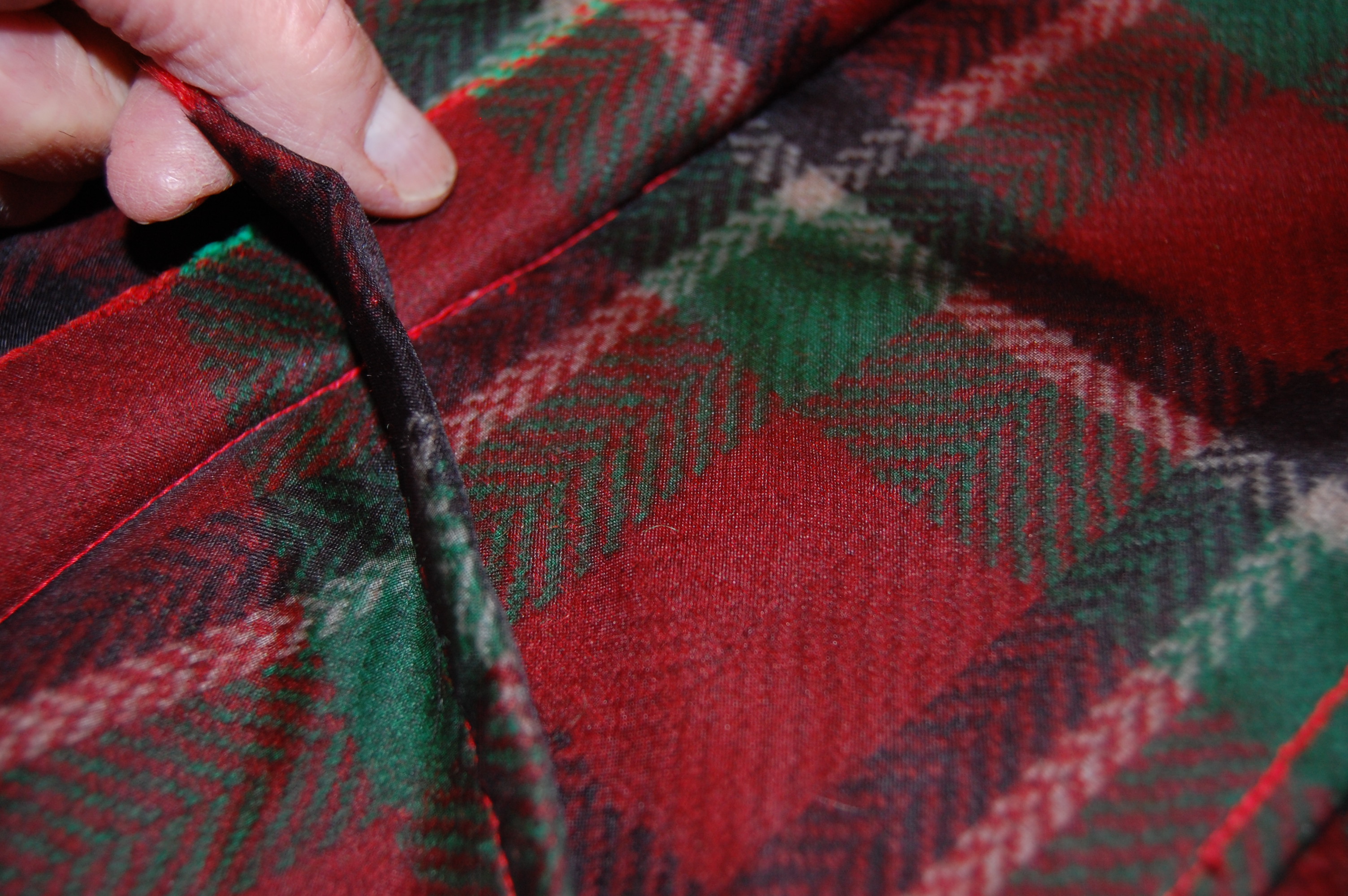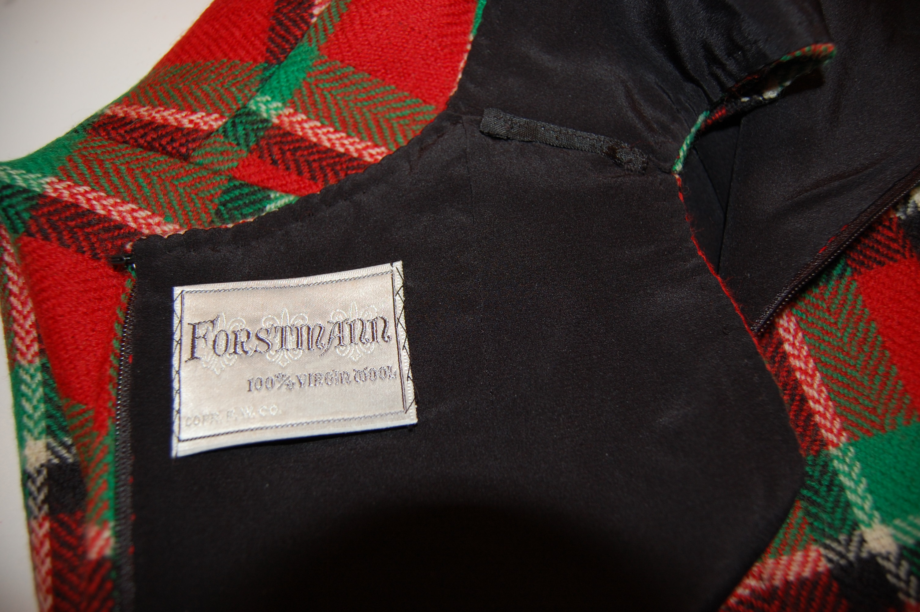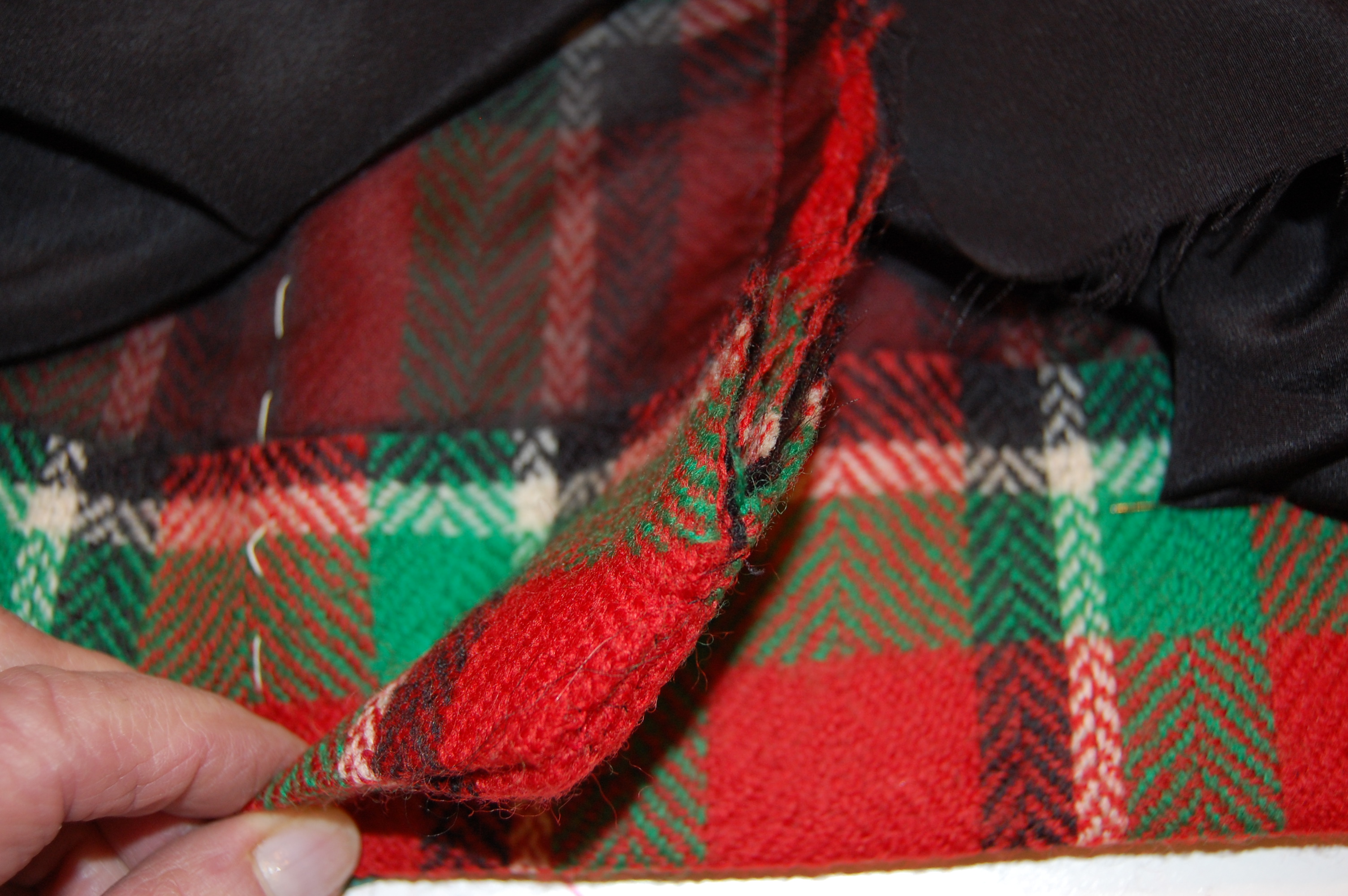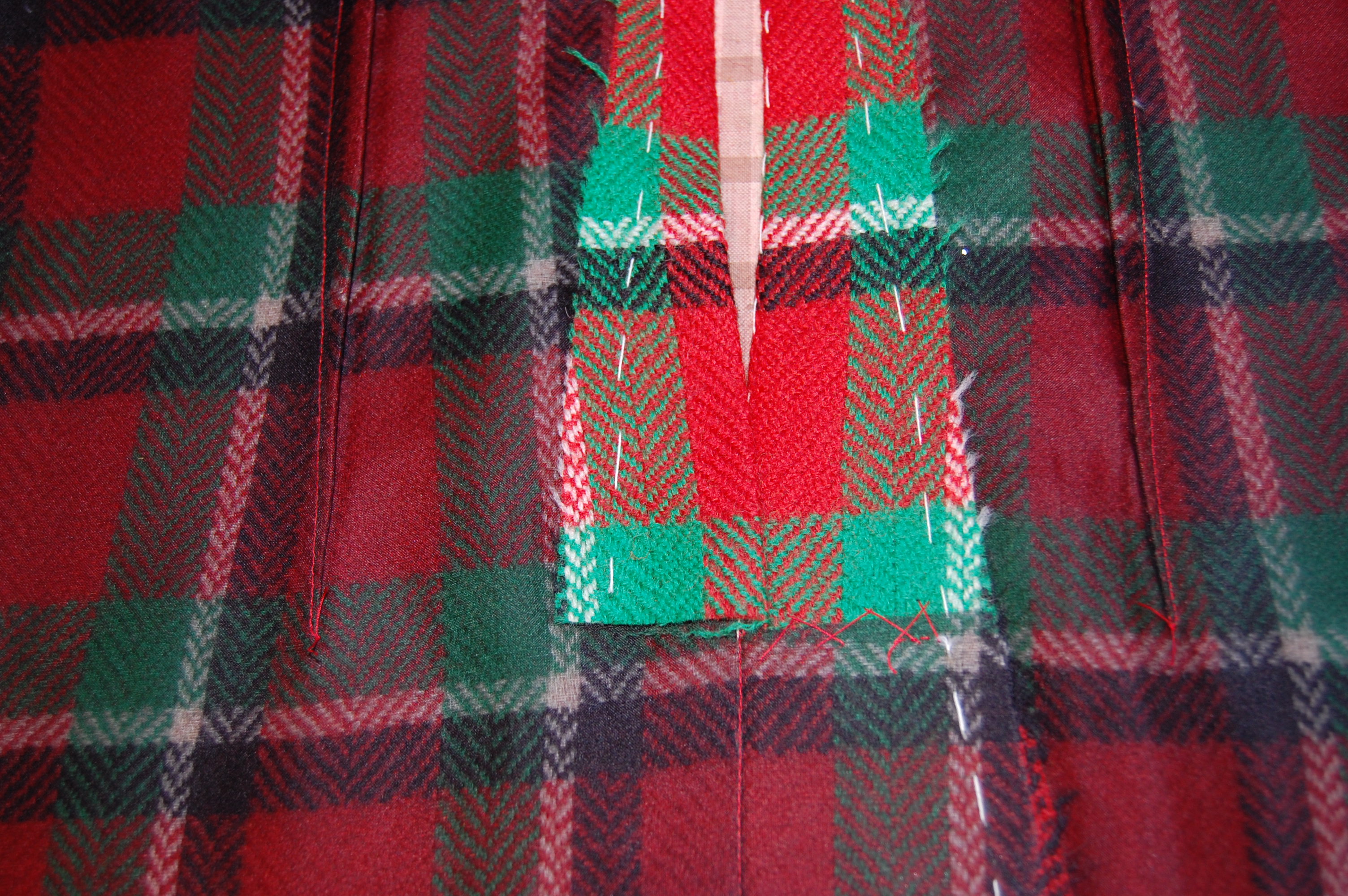 Having only 1.25 yards of this vintage wool restricted my options to either a simple sheath dress or a skirt. I opted for the sheath, with all good intentions of using the princess-lined pattern I had recently used for a pink dress in vintage Linton wool. In fact, one of the reasons I made the pink dress was to see if I would be able to successfully match plaids when I started on the red/green wool. (The weave of the pink Linton has a plaid woven into it, which I knew would be helpful to me in determining the pattern’s useability for a multi-color plaid.) Only one problem – when I laid out the pattern pieces on the Forstmann wool, I didn’t have enough fabric. I should have realized that the 7-panel princess dress would take more fabric than I had – and this time there was no making it work.