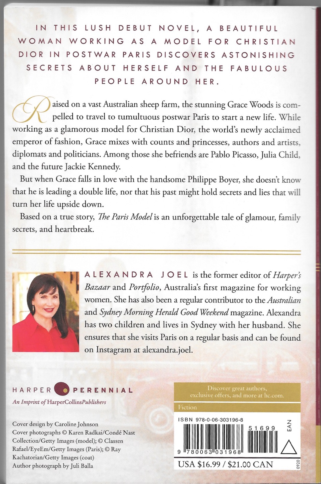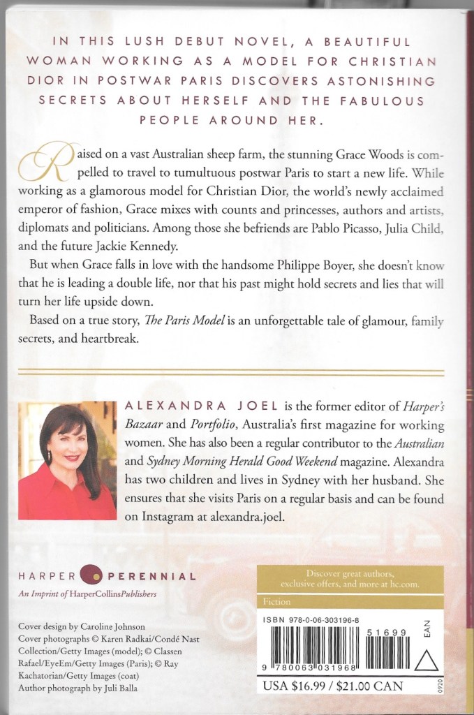 Based loosely on a true story, but definitely a work of fiction, The French Model, by Alexandra Joel, is the story of a stunningly beautiful young Australian woman who makes her way to Paris and becomes a model in Christian Dior’s House in post-war France. In leaving Australia, she is escaping not only from an unhappy marriage, but also from revelations about her past which make her question her identity and all those she has ever loved. This book has it all: mystery, espionage, love, fashion, friendship, sacrifice, sex, “very important person” sightings, political intrigue, history, and courage – all in a complex story line which will keep you on the edge of your seat. The writing is lovely and descriptive, the main characters endearing. Some of the story is a bit contrived – or unbelievable – but I was generally able to overlook those parts to enjoy the larger storyline. And I loved the emphasis on the workings of the House of Christian Dior. Anyone who loves vintage fashion – or historical fiction set at the end of World War II – should find escaping into this story a happy place to be.