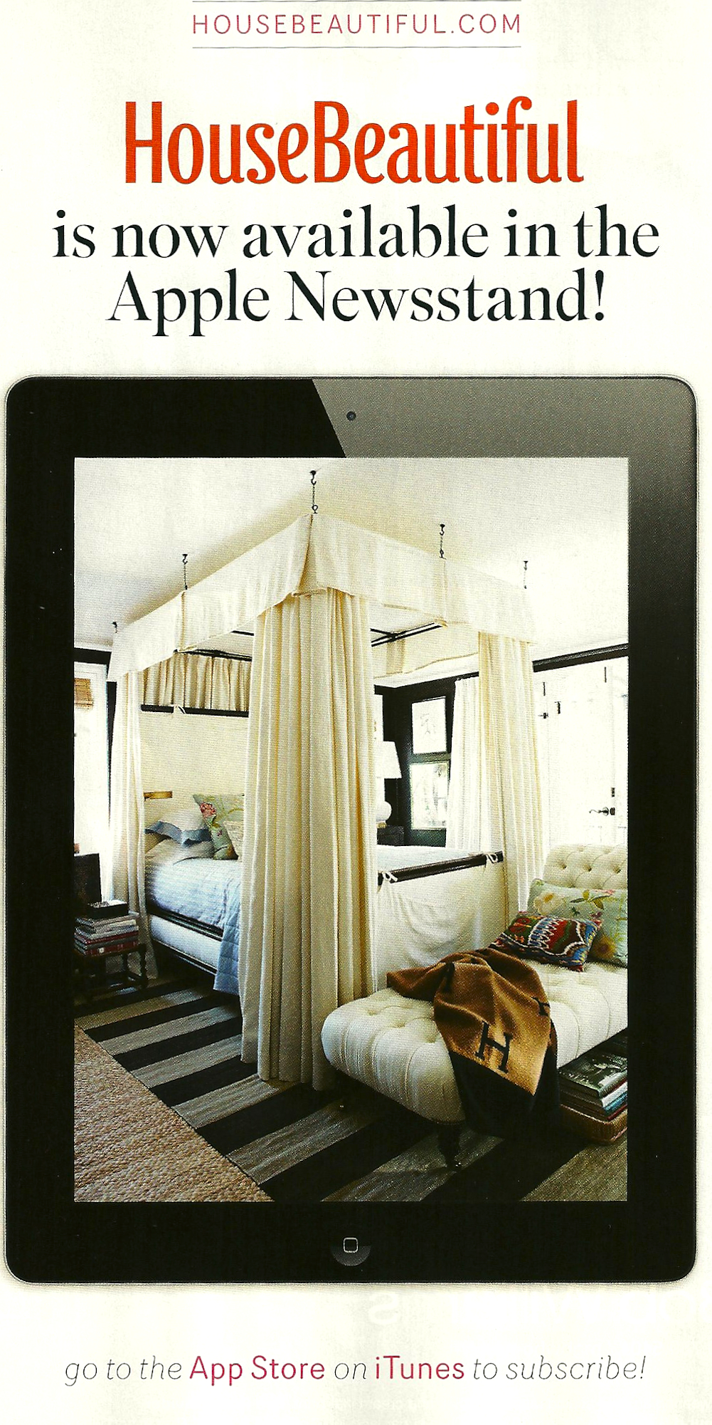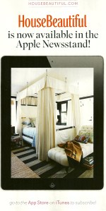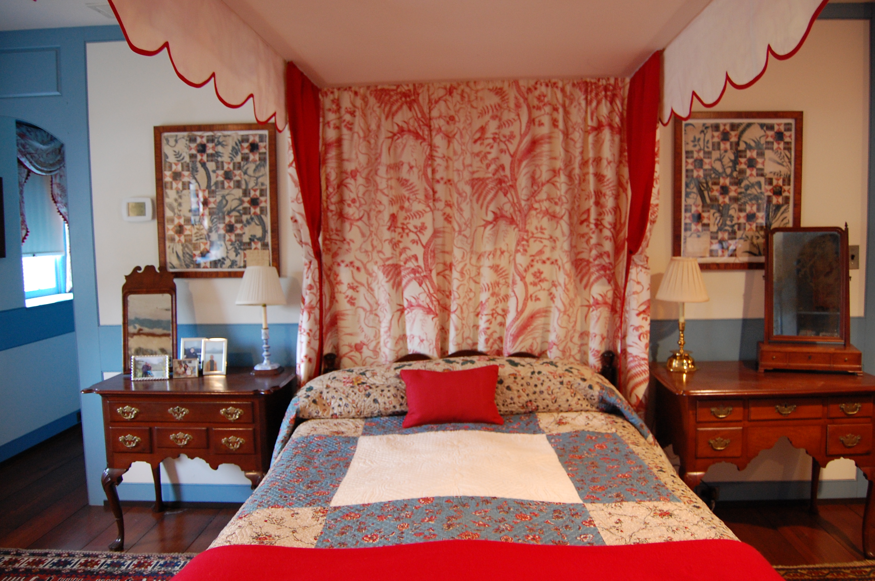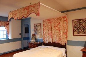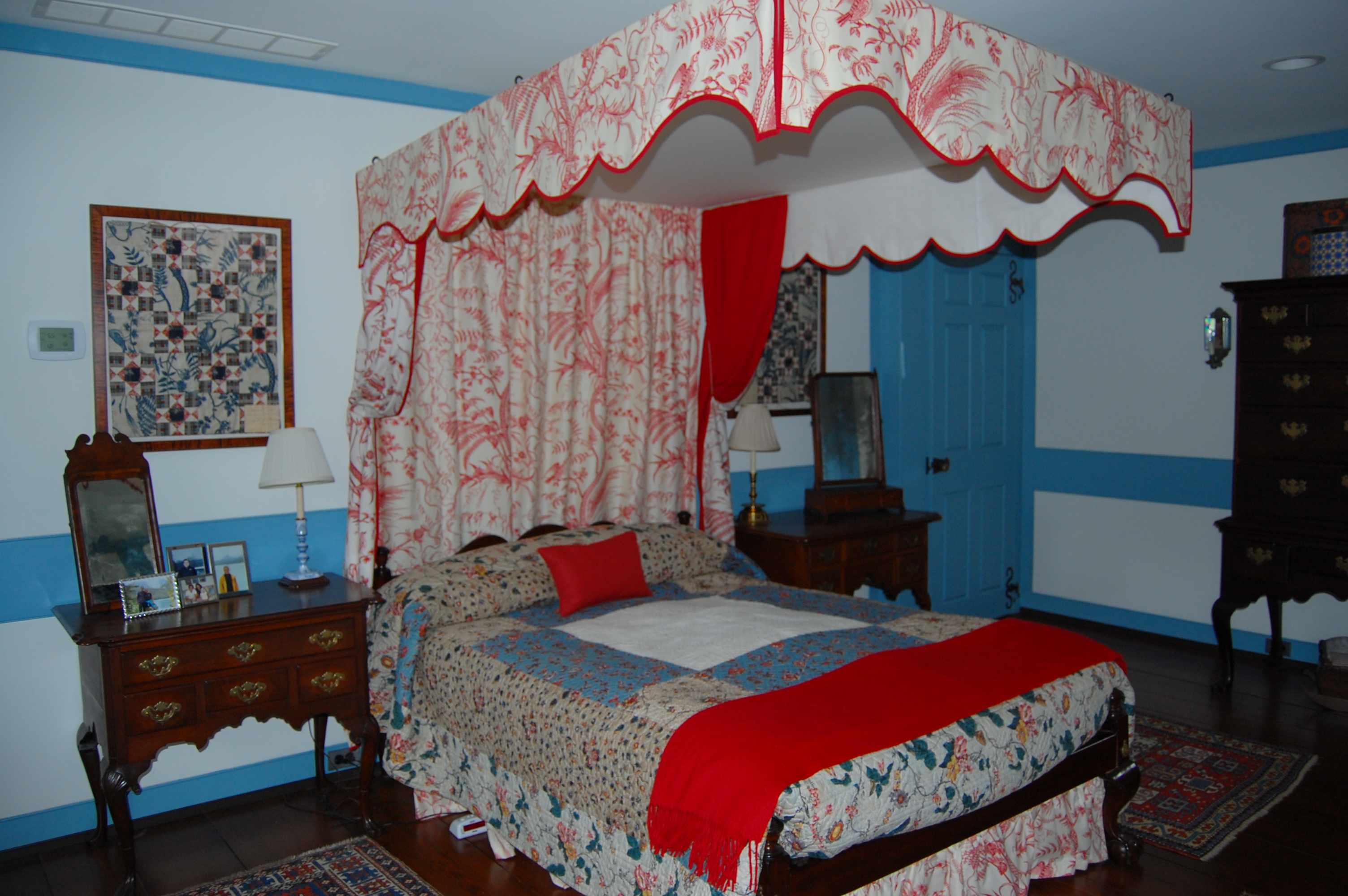 Although not common, in the 18th century flying testers were an ingenious way to dress a low-post bed for the winter – with heavy wool or linen hangings – or in the hot summers – with airy curtains to keep the flying bugs out. There is an example of a ceiling hook for a flying tester at Stenton in Philadelphia. (Stenton is the historic home of James Logan, 1674-1751, who was Secretary to William Penn, founder of Pennsylvania.) And imagine my surprise when just recently I saw an ad in House Beautiful Magazine which showed a modern bed with a flying tester!