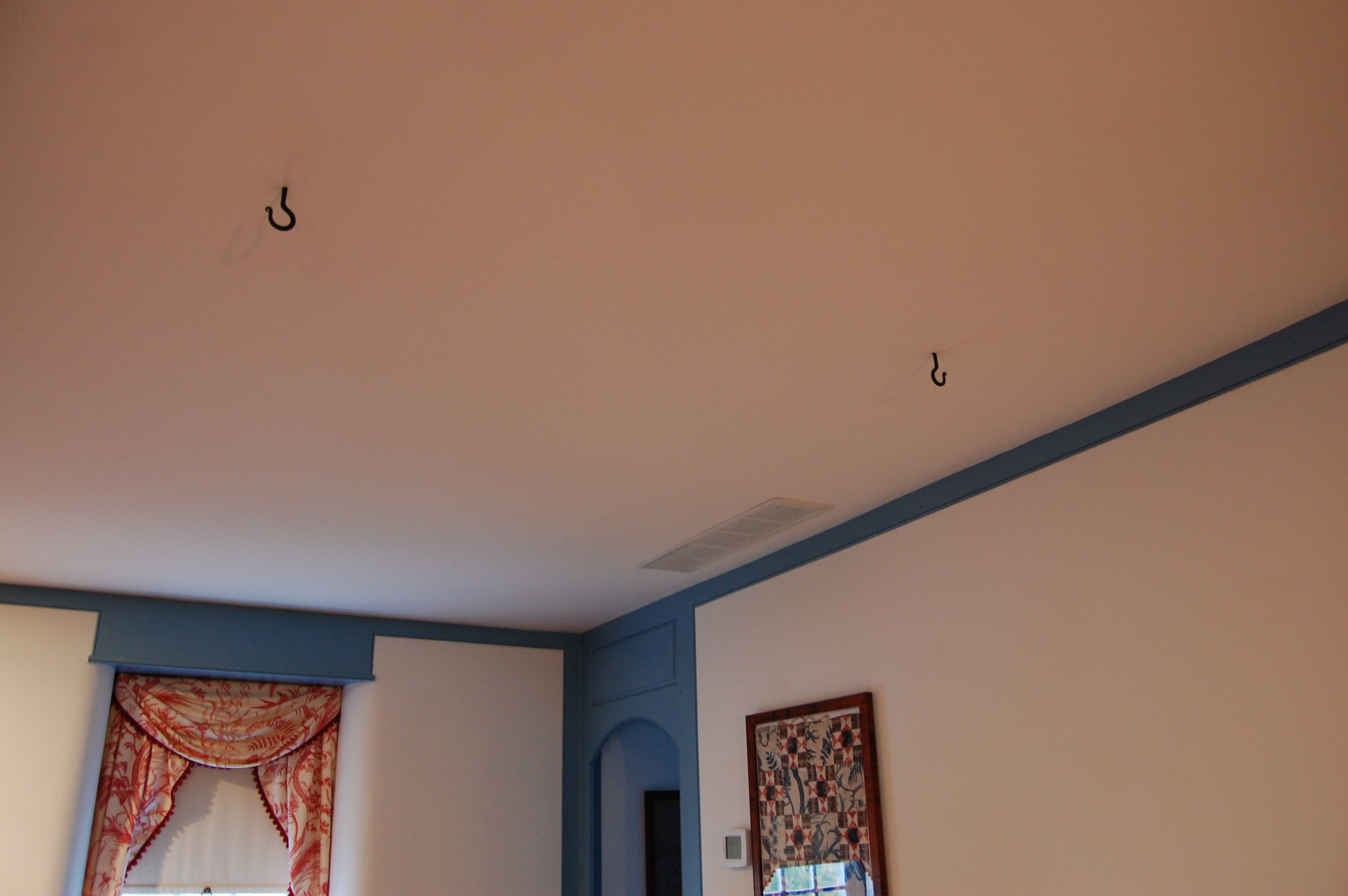 Here are the two wrought-iron hooks which we affixed into our ceiling. You can also see just a bit of one of the windows with the swag and jabot curtains.