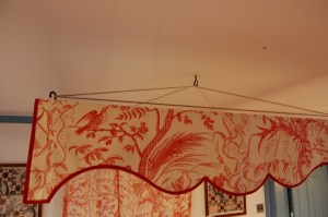 About three years later, our bed was borrowed by a local museum for an exhibit (we slept on a mattress on the floor during that time!), and it was displayed with a “flying tester” which they had made just for the bed. A flying tester is a wooden frame on which hangings can be affixed; the wooden frame is suspended by ropes from iron hooks in the ceiling.