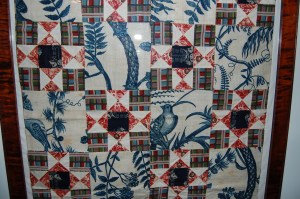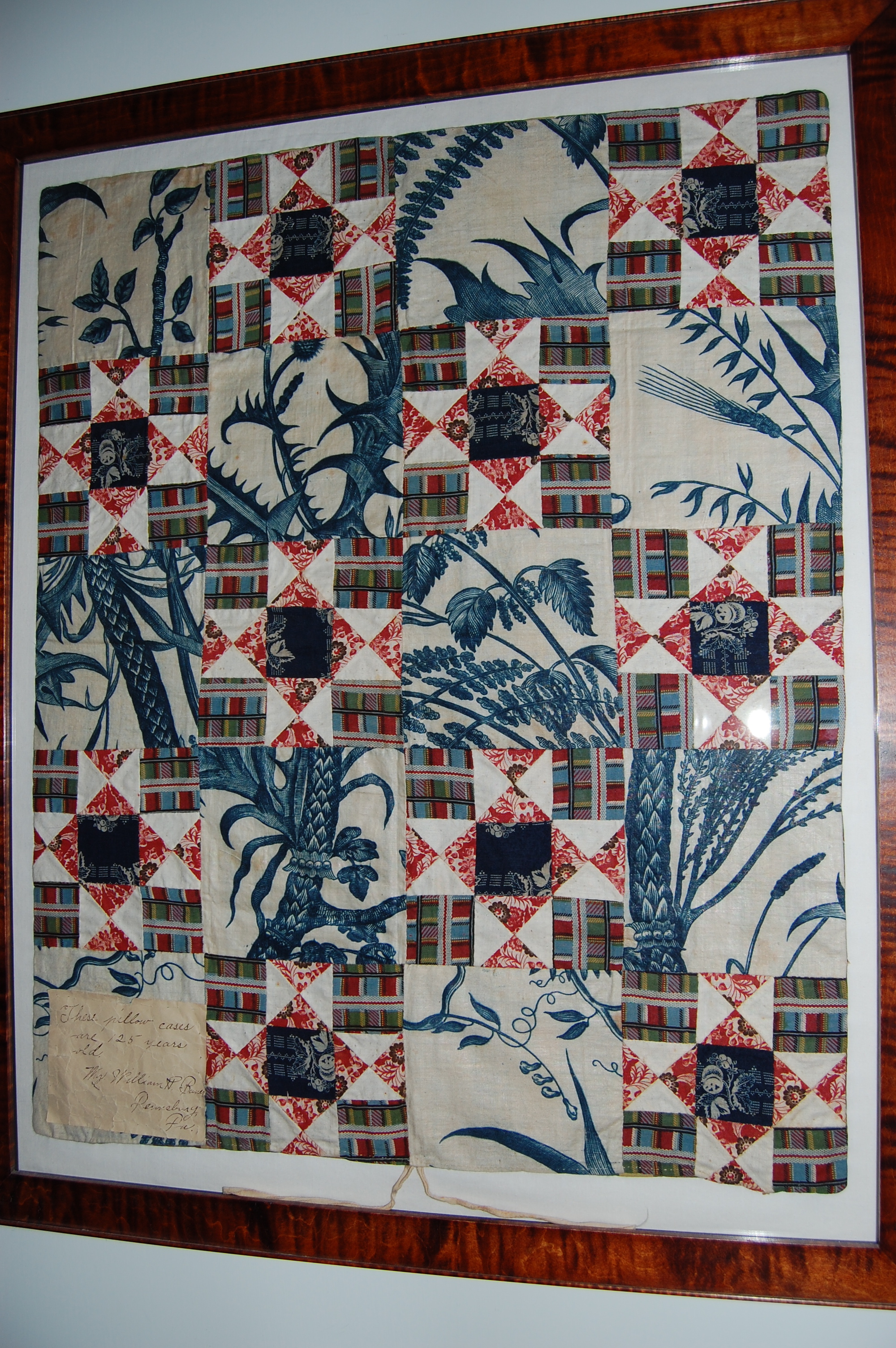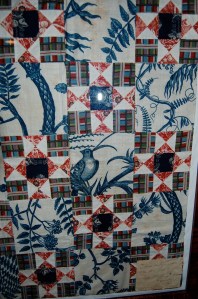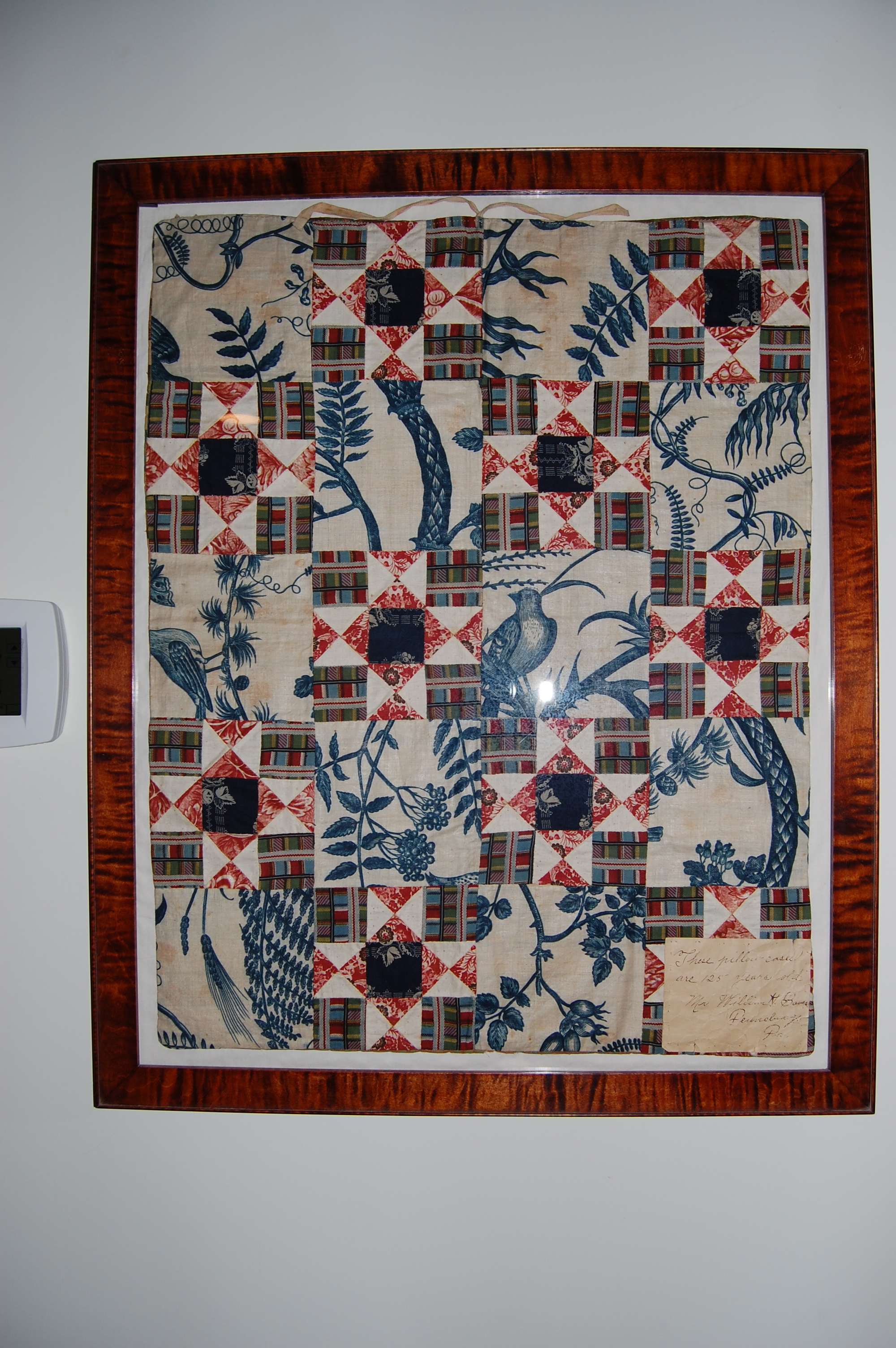 After the exhibit was dismantled, we were generously offered the tester frame, which we wrapped in plastic and put in storage. I started thinking how neat it would be to make hangings some day, but somehow the years passed by. Perhaps I needed some inspiration to tackle what I knew was going to be a big, somewhat intimidating project. Well – the inspiration came in two parts. First I came across a pair of pieced pillowcases, which date to about 1800-1820. One of the fabrics in them is – you guessed it – some 18th-century Bird and Thistle fabric (which was imported to America from England). These pieces were in blue, not red like my curtains, which is one of several colorways in which the fabric is available now.
