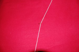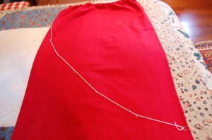 3) I proceeded to apply the red taping (which I cut on the bias) to all the edges. This was all handwork and every edge had to be sewn twice, once on the front and once on the back.