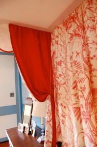 1) After measuring and thinking and measuring some more, I knew I didn’t have enough fabric left over from the curtains to complete the hangings, although I was close! I knew I could do some careful piecing and re-sectioning to match and cut out everything (three valences and the back curtain) except for the side curtains. I went on eBay and found a length of the same fabric which would suffice for the side curtains, if I lined them in another fabric. (The piece I found on eBay was of another dye lot, of course, but the difference was slight so I decided it would work.) I found a linen blend in solid red which I determined would be perfect for the taping (which would finish every exposed edge) and for lining the side curtains.