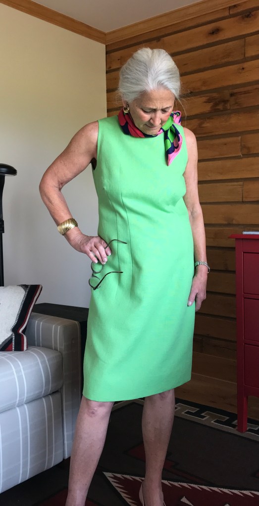 To complete the early 1960s’ essence of this dress, I can pair it with a vintage ‘60s’ Guillemin scarf, also found on eBay. The pink in the scarf doesn’t match the pink lining, but since the lining does not show, it only matters to me (and now all of you also know this little fact!)